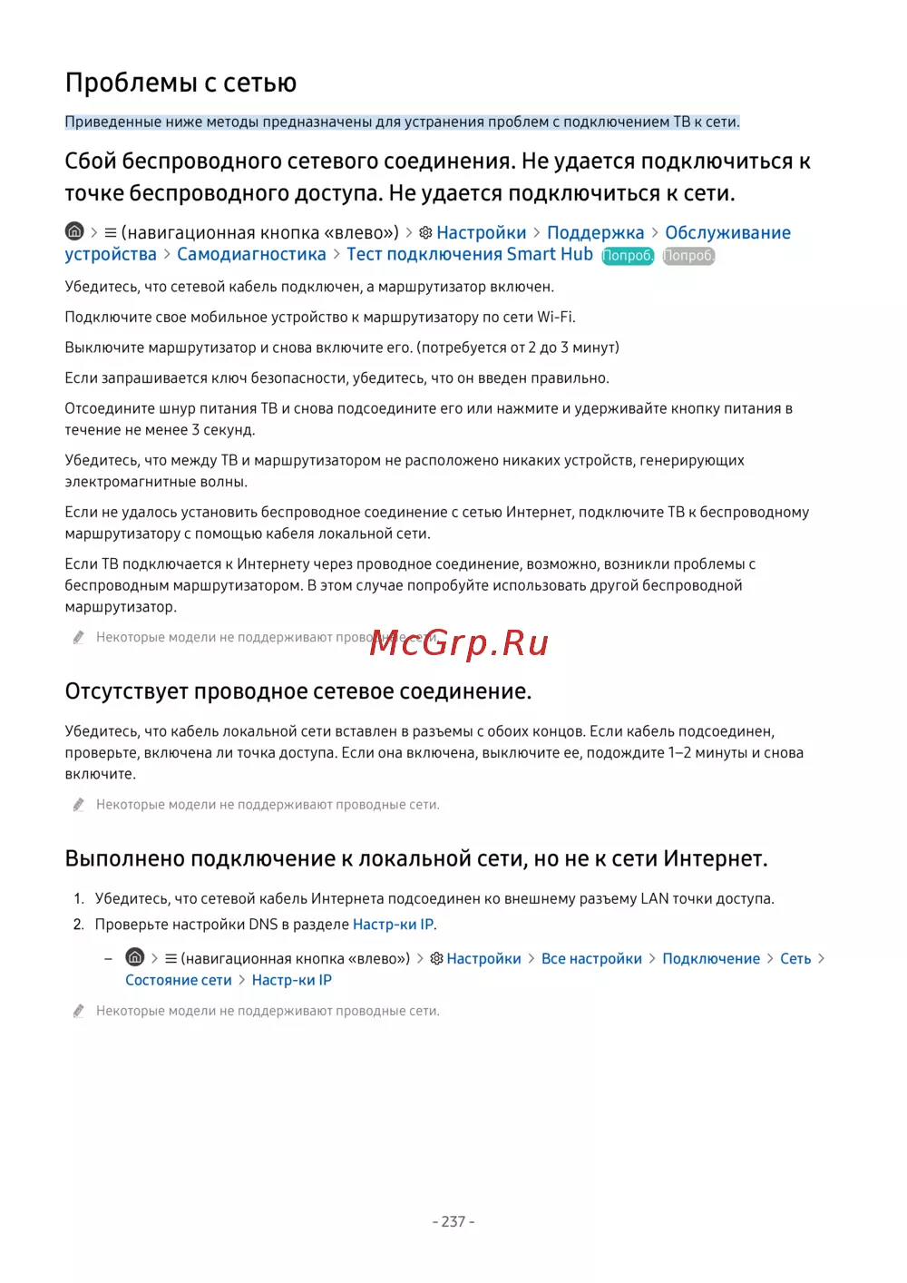 Если ТВ подключается к Интернету через проводное соединение, возможно, возникли проблемы с