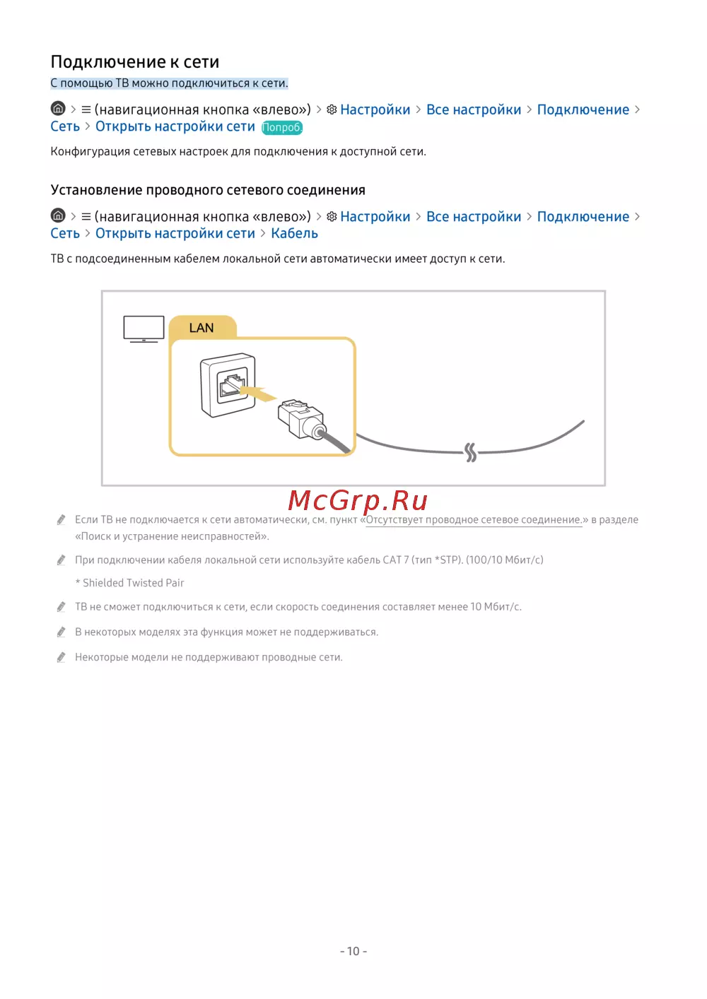 ТВ не сможет подключиться к сети, если скорость соединения составляет менее 10 Мбит/с.