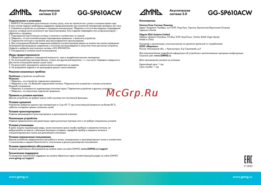GMNG GG-SP520ACWИнструкция по эксплуатации -
