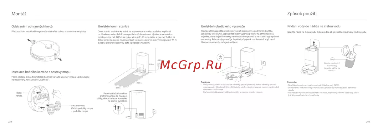 Naučte se, jak správně nainstalovat boční kartáč a mop robotického vysavače. Získejte tipy na umístění omni stanice a naplnění nádrže na vodu pro efektivní úklid.
