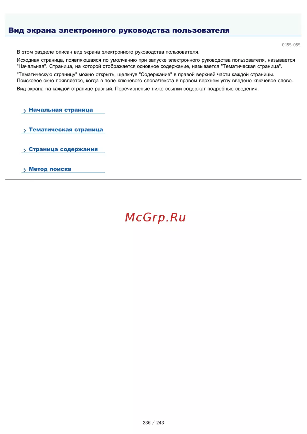 Вид экрана электронного руководства пользователя 0455 055 В этом разделе описан вид экрана электронного руководства пользователя Исходная страница появляющаяся по умолчанию при запуске электронного руководства пользователя называется Начальная Страница на которой отображается основное содержание называется Тематическая страница Тематическую страницу можно открыть щелкнув Содержание в правой верхней части каждой страницы Поисковое окно появляется когда в поле ключевого слова текста в правом верхнем углу введено ключевое слово Вид экрана на каждой странице разный Перечисленью ниже ссылки содержат подробные сведения Начальная страница Тематическая страница Страница содержания Метод поиска 236 243
