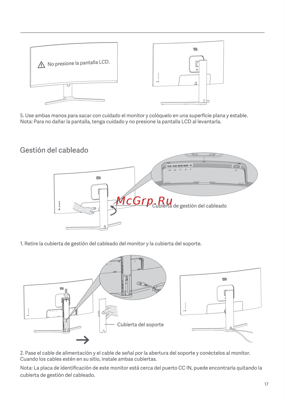 5 Use ambas manos para sacar con cuidado el monitor y colóquelo en una superficie plana y estable Nota Para no dañar la pantalla tenga cuidado y no presione la pantalla LCD al levantarla Gestión del cableado Cubierta de gestión del cableado 1 Retire la cubierta de gestión del cableado del monitory la cubierta del soporte 2 Pase el cable de alimentación y el cable de señal por la abertura del soporte y conéctelos al monitor Cuando los cables estén en su sitio instale ambas cubiertas Nota La placa de identificación de este monitor está cerca del puerto CC IN puede encontrarla quitando la cubierta de gestión del cableado 17