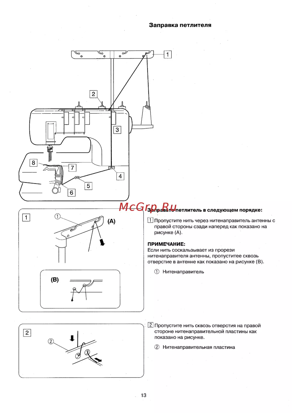 Заправка петлителя Заправьте петлитель в следующем порядке Ш Пропустите нить через нитенаправитель антенны с правой стороны сзади наперед как показано на рисунке А ПРИМЕЧАНИЕ Если нить соскальзывает из прорези нитенаправителя антенны пропуститее сквозь отверстие в антенне как показано на рисунке В ф Нитенаправитель й Пропустите нить сквозь отверстия на правой стороне нитенаправительной пластины как показано на рисунке Нитенаправительная пластина 13