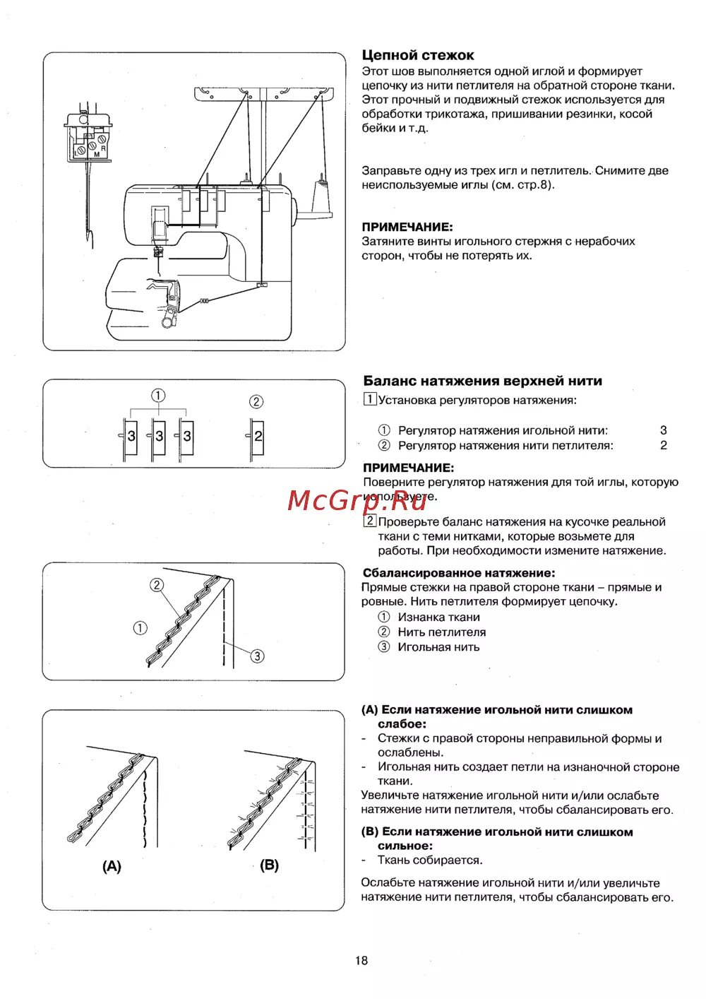 Цепной стежок Этот шов выполняется одной иглой и формирует цепочку из нити петлителя на обратной стороне ткани Этот прочный и подвижный стежок используется для обработки трикотажа пришивании резинки косой бейки и т д Заправьте одну из трех игл и петлитель Снимите две неиспользуемые иглы см стр 8 ПРИМЕЧАНИЕ Затяните винты игольного стержня с нерабочих сторон чтобы не потерять их Баланс натяжения верхней нити ШУстановка регуляторов натяжения ф Регулятор натяжения игольной нити Регулятор натяжения нити петлителя 3 2 ПРИМЕЧАНИЕ Поверните регулятор натяжения для той иглы которую используете Проверьте баланс натяжения на кусочке реальной ткани с теми нитками которые возьмете для работы При необходимости измените натяжение Сбалансированное натяжение Прямые стежки на правой стороне ткани прямые и ровные Нить петлителя формирует цепочку ф Изнанка ткани Нить петлителя Игольная нить А Если натяжение игольной нити слишком слабое Стежки с правой стороны неправильной формы и ослаблены Игольная нить создает петли на изнаночной стороне ткани Увеличьте натяжение игольной нити и или ослабьте натяжение нити петлителя чтобы сбалансировать его В Если натяжение игольной нити слишком сильное Ткань собирается Ослабьте натяжение игольной нити и или увеличьте натяжение нити петлителя чтобы сбалансировать его 18