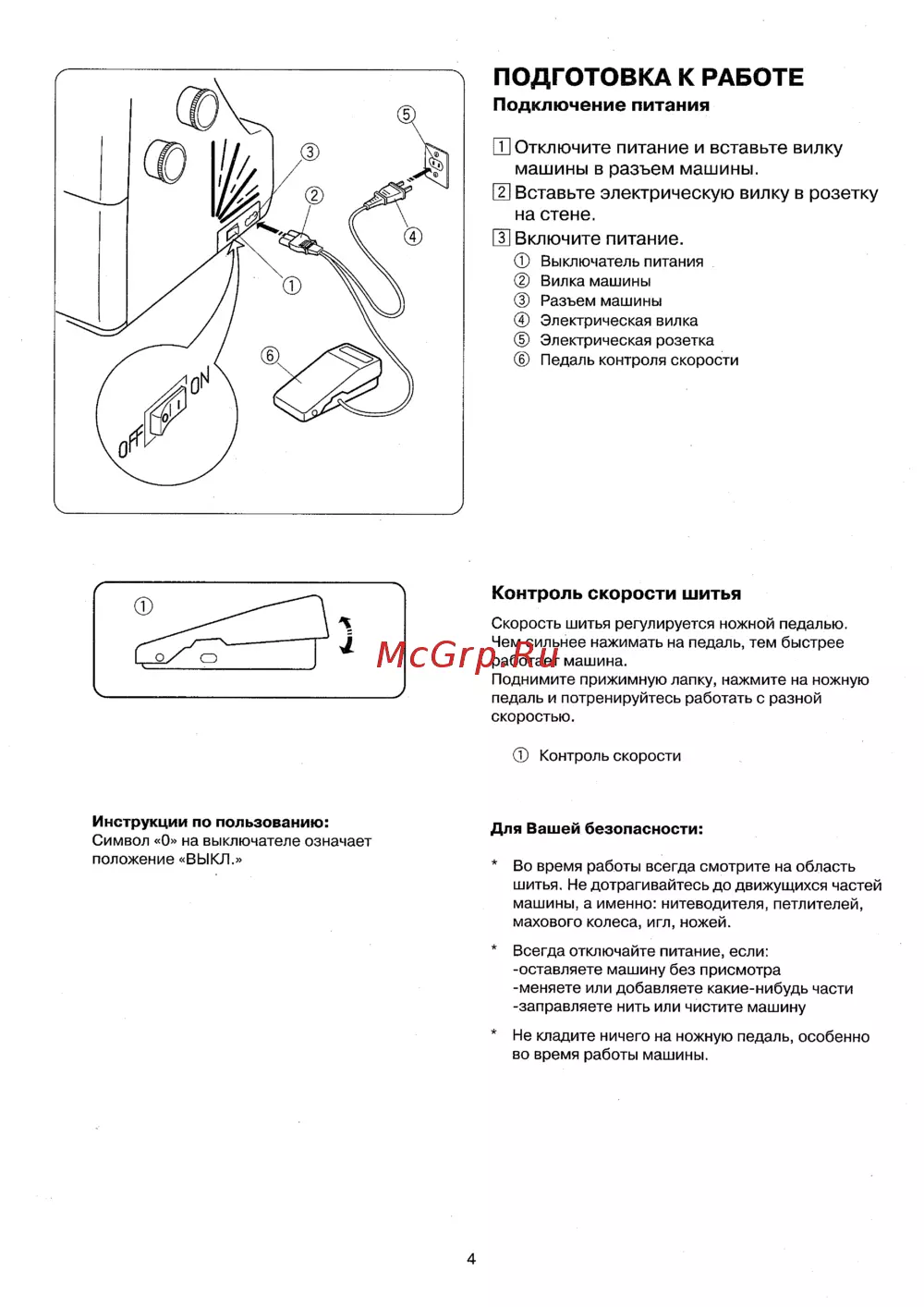 ПОДГОТОВКА К РАБОТЕ Подключение питания Ш Отключите питание и вставьте вилку машины в разъем машины XI Вставьте электрическую вилку в розетку на стене Ш Включите питание Выключатель питания Вилка машины Разъем машины Электрическая вилка Электрическая розетка Педаль контроля скорости Контроль скорости шитья Скорость шитья регулируется ножной педалью Чем сильнее нажимать на педаль тем быстрее работает машина Поднимите прижимную лапку нажмите на ножную педаль и потренируйтесь работать с разной скоростью Контроль скорости Инструкции по пользованию Символ О на выключателе означает положение ВЫКЛ Для Вашей безопасности Во время работы всегда смотрите на область шитья Не дотрагивайтесь до движущихся частей машины а именно нитеводителя петлителей махового колеса игл ножей Всегда отключайте питание если оставляете машину без присмотра меняете или добавляете какие нибудь части заправляете нить или чистите машину Не кладите ничего на ножную педаль особенно во время работы машины 4