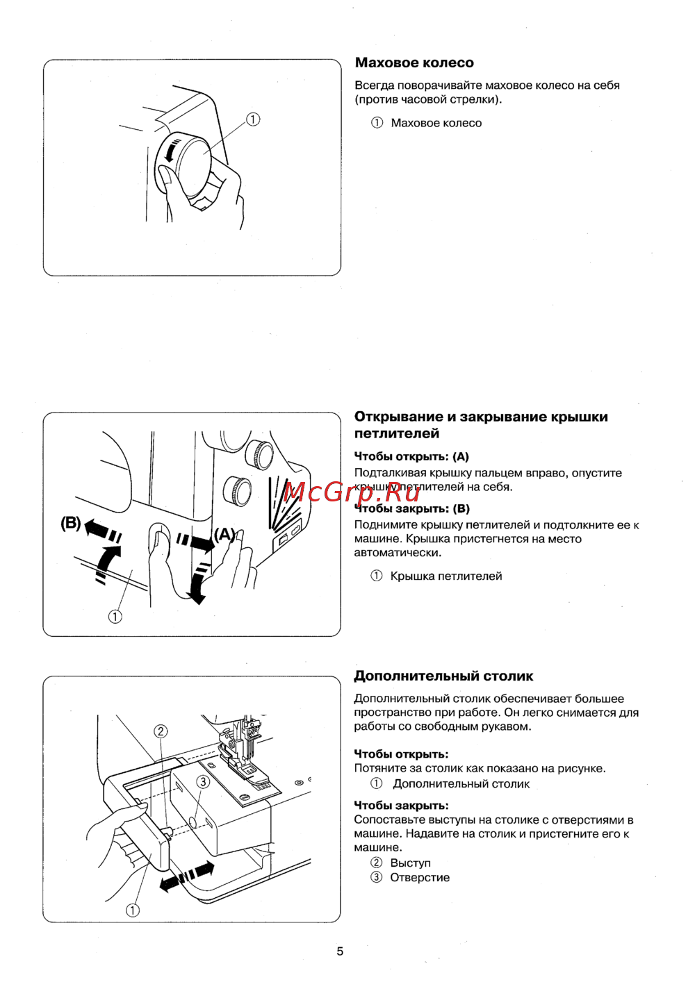 Маховое колесо Всегда поворачивайте маховое колесо на себя против часовой стрелки ф Маховое колесо Открывание и закрывание крышки петлителей Чтобы открыть А Подталкивая крышку пальцем вправо опустите крышку петлителей на себя Чтобы закрыть В Поднимите крышку петлителей и подтолкните ее к машине Крышка пристегнется на место автоматически ф Крышка петлителей Дополнительный столик Дополнительный столик обеспечивает большее пространство при работе Он легко снимается для работы со свободным рукавом Чтобы открыть Потяните за столик как показано на рисунке ф Дополнительный столик Чтобы закрыть Сопоставьте выступы на столике с отверстиями в машине Надавите на столик и пристегните его к машине Выступ Отверстие 5