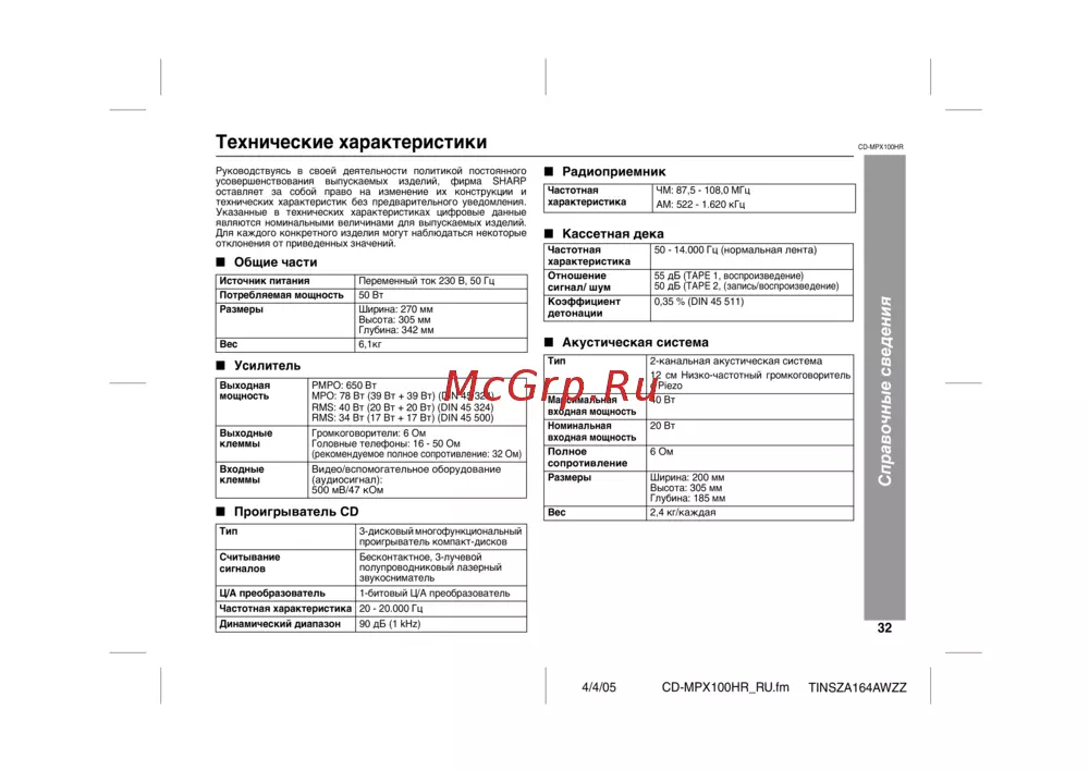 Sharp CD-MPX100HR [35/36] Технические характеристики