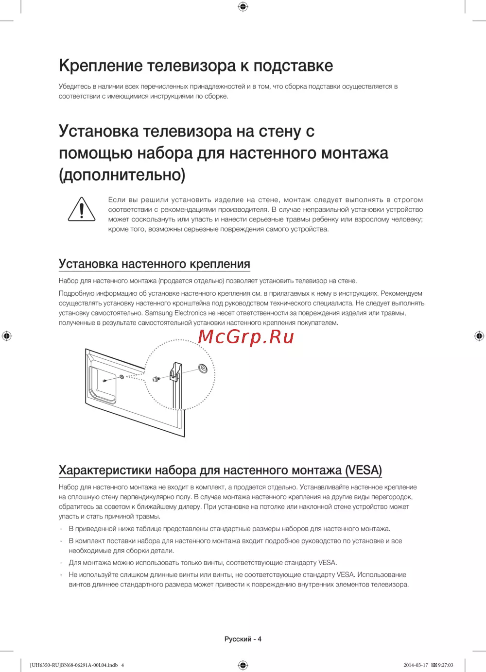 - Установка телевизора на стену с помощью набора для настенного монтажа дополнительно p.4