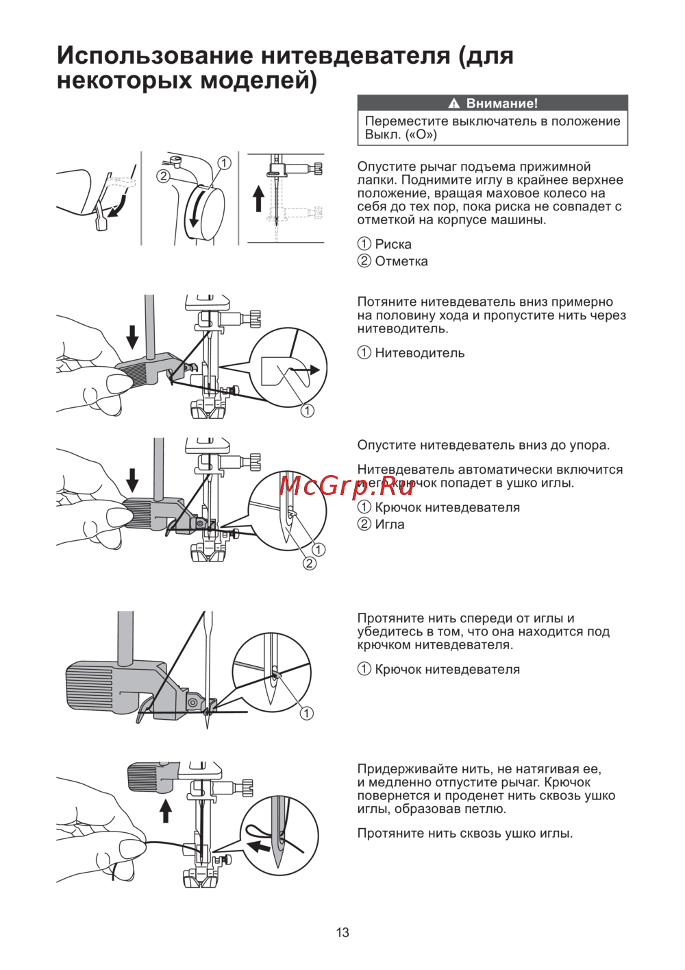 Использование нитевдевателя для некоторых моделей ______________ А Внимание Переместите выключатель в положение Выкл О Опустите рычаг подъема прижимной лапки Поднимите иглу в крайнее верхнее положение вращая маховое колесо на себя до тех пор пока риска не совпадет с отметкой на корпусе машины ф Риска ф Отметка Потяните нитевдеватель вниз примерно на половину хода и пропустите нить через нитеводитель ф Нитеводитель Опустите нитевдеватель вниз до упора Нитевдеватель автоматически включится и его крючок попадет в ушко иглы ф Крючок нитевдевателя 2 Игла Протяните нить спереди от иглы и убедитесь в том что она находится под крючком нитевдевателя ф Крючок нитевдевателя Придерживайте нить не натягивая ее и медленно отпустите рычаг Крючок повернется и проденет нить сквозь ушко иглы образовав петлю Протяните нить сквозь ушко иглы 13