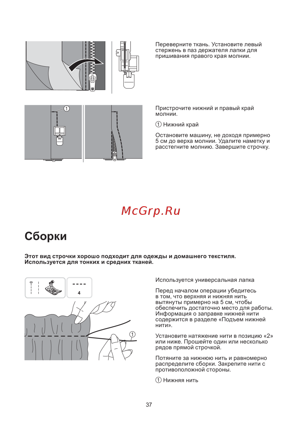 Переверните ткань Установите левый стержень в паз держателя лапки для пришивания правого края молнии Пристрочите нижний и правый край молнии ф Нижний край Остановите машину не доходя примерно 5 см до верха молнии Удалите наметку и расстегните молнию Завершите строчку Сборки Этот вид строчки хорошо подходит для одежды и домашнего текстиля Используется для тонких и средних тканей Используется универсальная лапка Перед началом операции убедитесь в том что верхняя и нижняя нить вытянуты примерно на 5 см чтобы обеспечить достаточно место для работы Информация о заправке нижней нити содержится в разделе Подъем нижней нити Установите натяжение нити в позицию 2 или ниже Прошейте один или несколько рядов прямой строчкой Потяните за нижнюю нить и равномерно распределите сборки Закрепите нити с противоположной стороны ф Нижняя нить 37