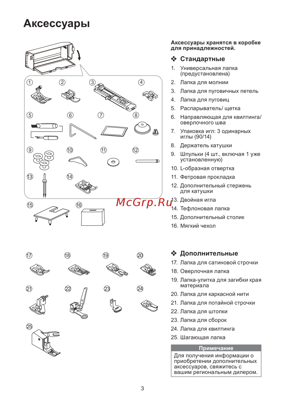 Аксессуары Аксессуары хранятся в коробке для принадлежностей Стандартные 1 Универсальная лапка предустановлена 2 Лапка для молнии 3 Лапка для пуговичных петель 4 Лапка для пуговиц 5 Распарыватель щетка 6 Направляющая для квилтинга оверлочного шва 7 Упаковка игл 3 одинарных иглы 90 14 8 Держатель катушки 9 Шпульки 4 шт включая 1 уже установленную 10 Ь образная отвертка 11 Фетровая прокладка 12 Дополнительный стержень для катушки 13 Двойная игла 14 Тефлоновая лапка 15 Дополнительный столик 16 Мягкий чехол Дополнительные 17 Лапка для сатиновой строчки 18 Оверлочная лапка 19 Лапка улитка для загибки края материала 20 Лапка для каркасной нити 21 Лапка для потайной строчки 22 Лапка для штопки 23 Лапка для сборок 24 Лапка для квилтинга 25 Шагающая лапка Примечание Для получения информации о приобретении дополнительных аксессуаров свяжитесь с вашим региональным дилером 3