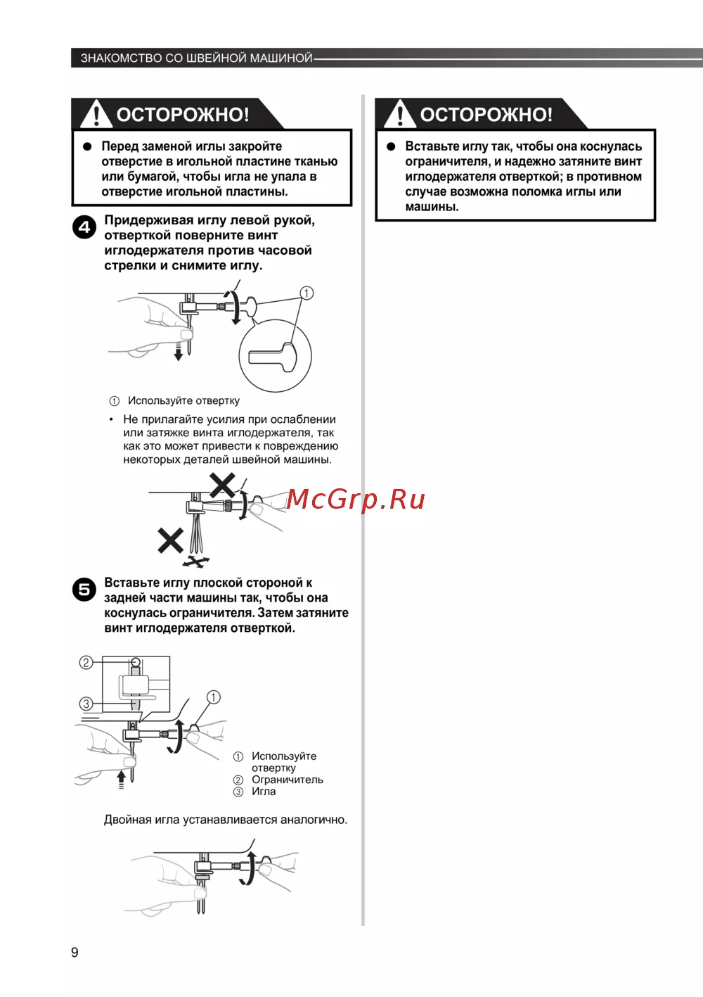 - Убедитесь что шпульный колпачок вставлен правильно так как в противном случае игла может сломаться p.42