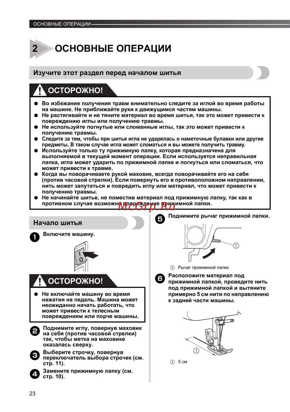 - Не включайте машину во время нажатия на педаль машина может неожиданно начать работать что может привести к телесным повреждениям или порче машины p.40
