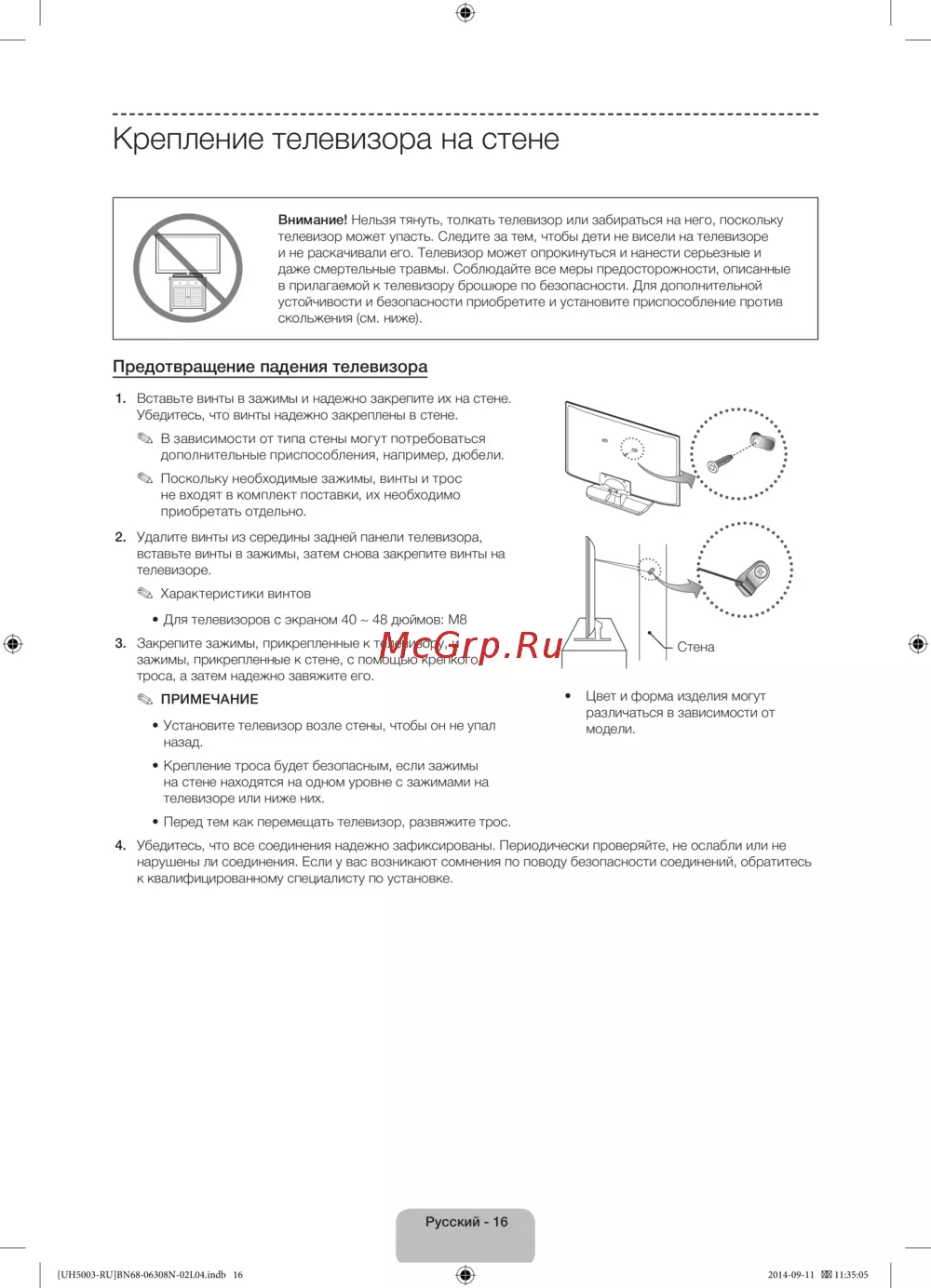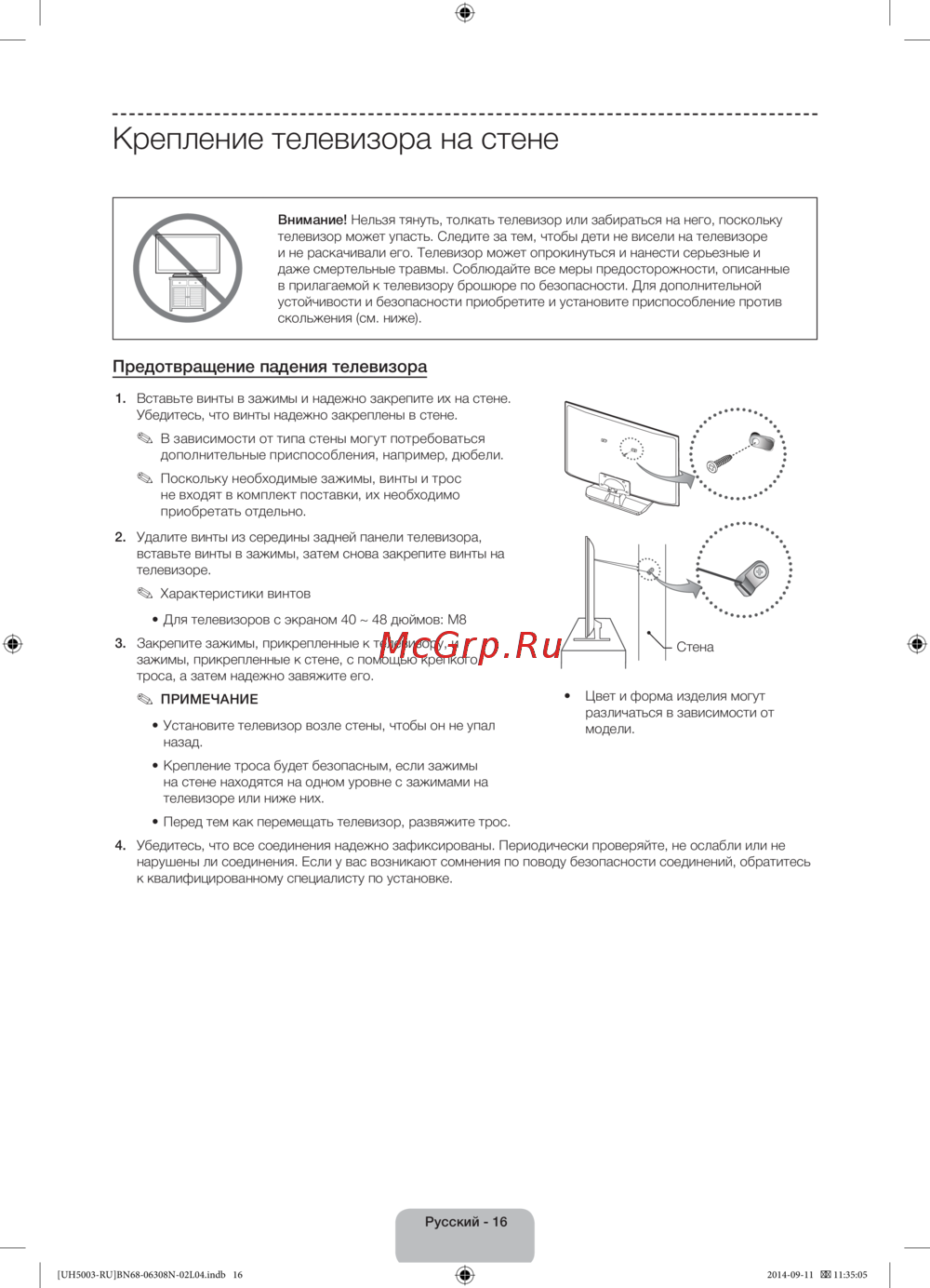 Внимание! Нельзя тянуть, толкать телевизор или забираться на него, поскольку