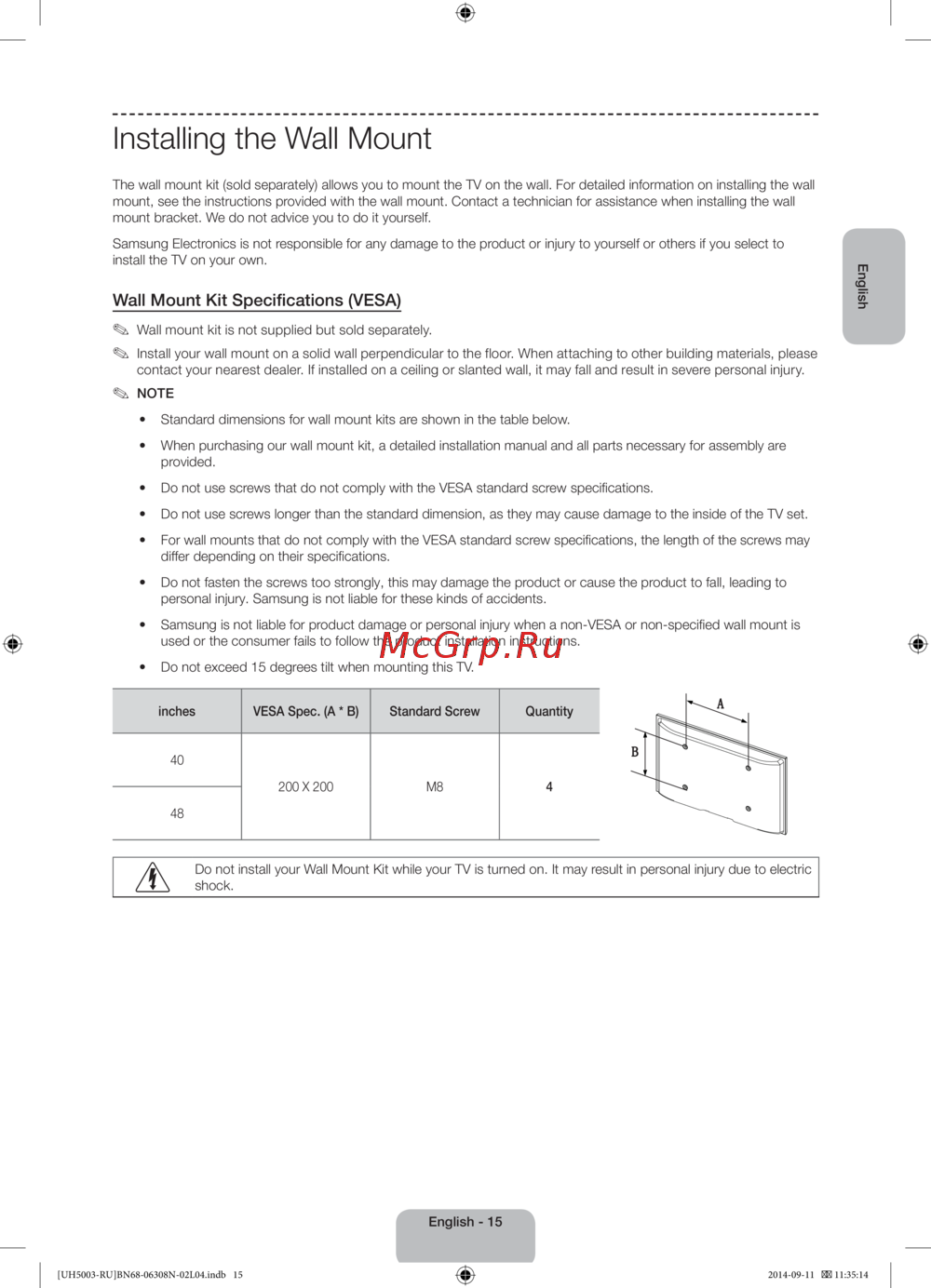 Samsung UE48H5003AK [39/95] Wall mount kit specifications vesa