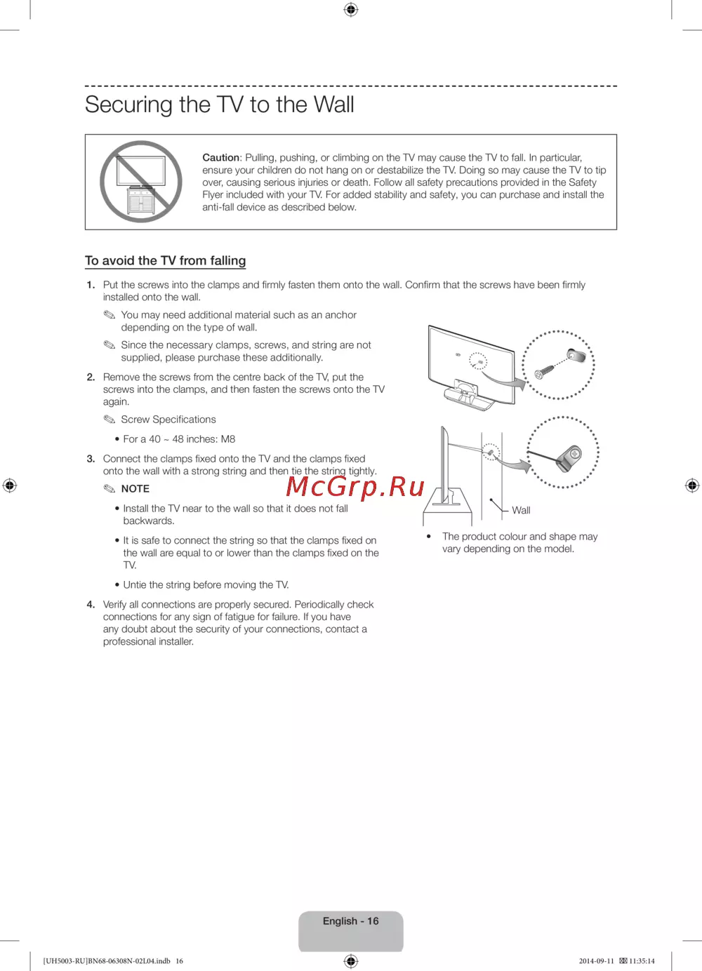 Caution: Pulling, pushing, or climbing on the TV may cause the TV to fall. In particular,