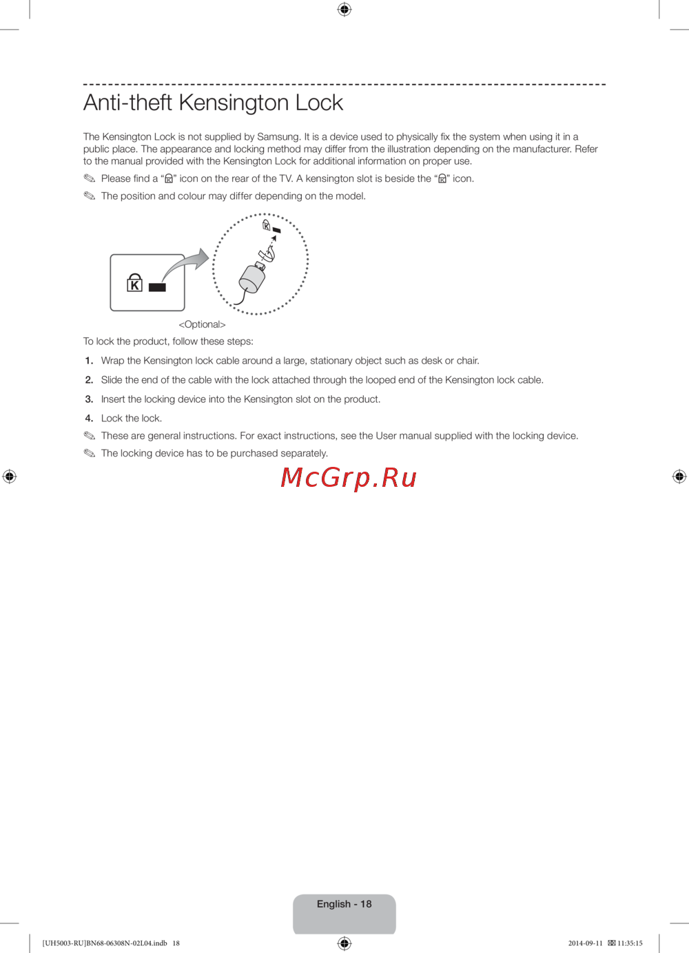 The Kensington Lock is not supplied by Samsung. It is a device used to physically fix the system when using it in a