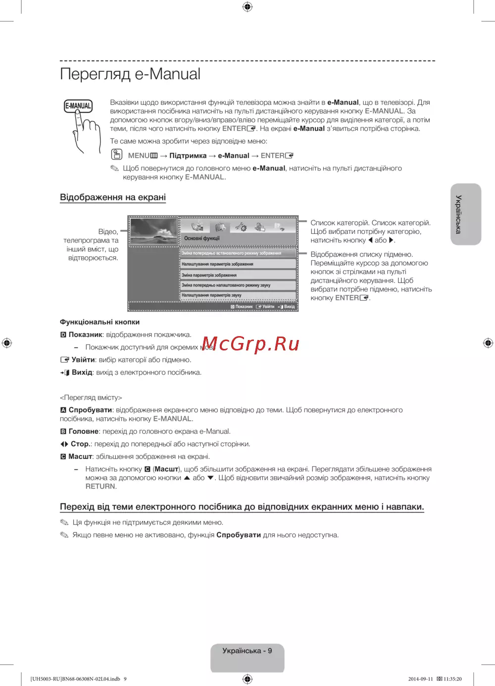 Щоб повернутися до головного меню e-Manual, натисніть на пульті дистанційного