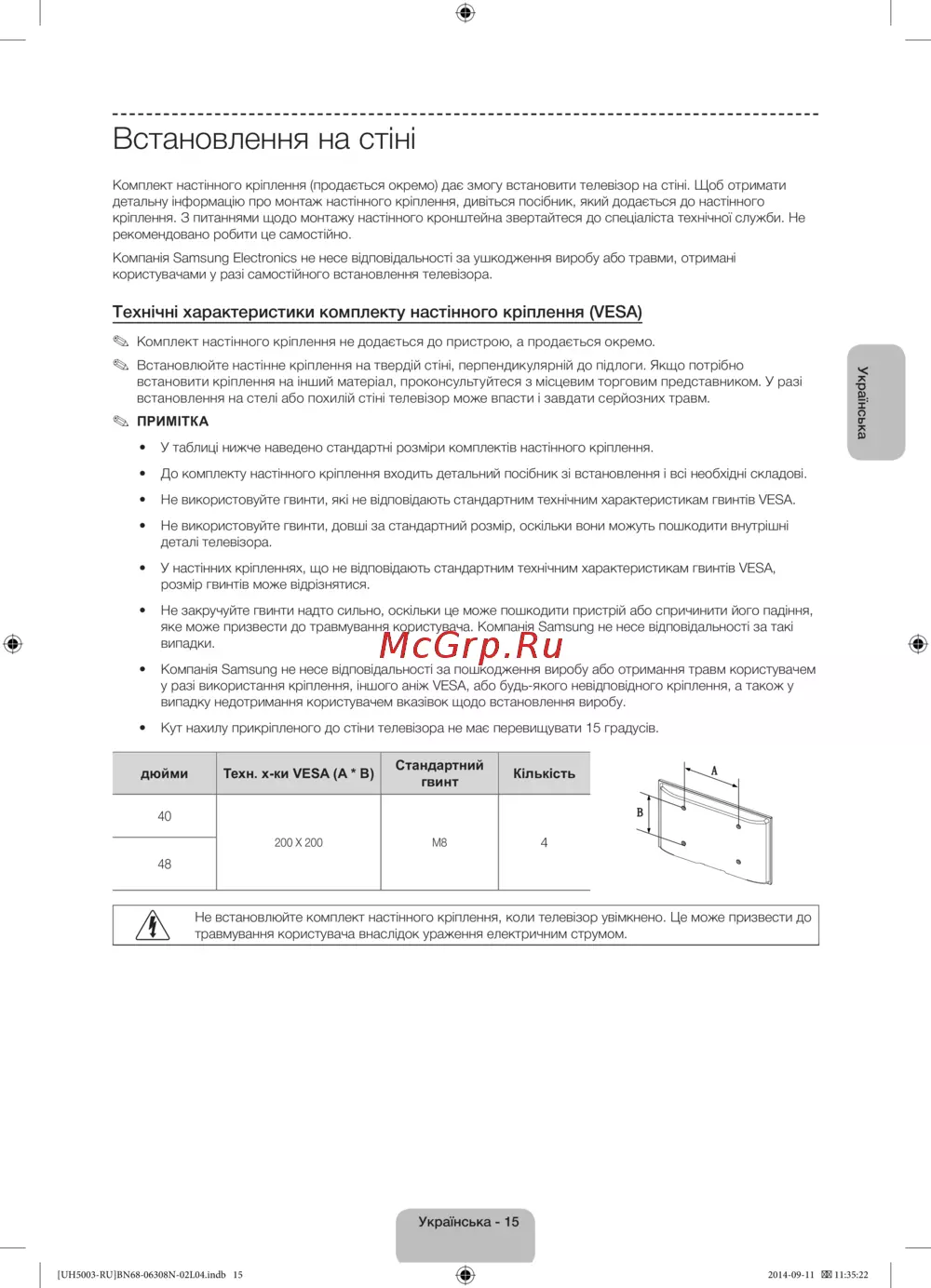 встановлення на стелі або похилій стіні телевізор може впасти і завдати серйозних травм.