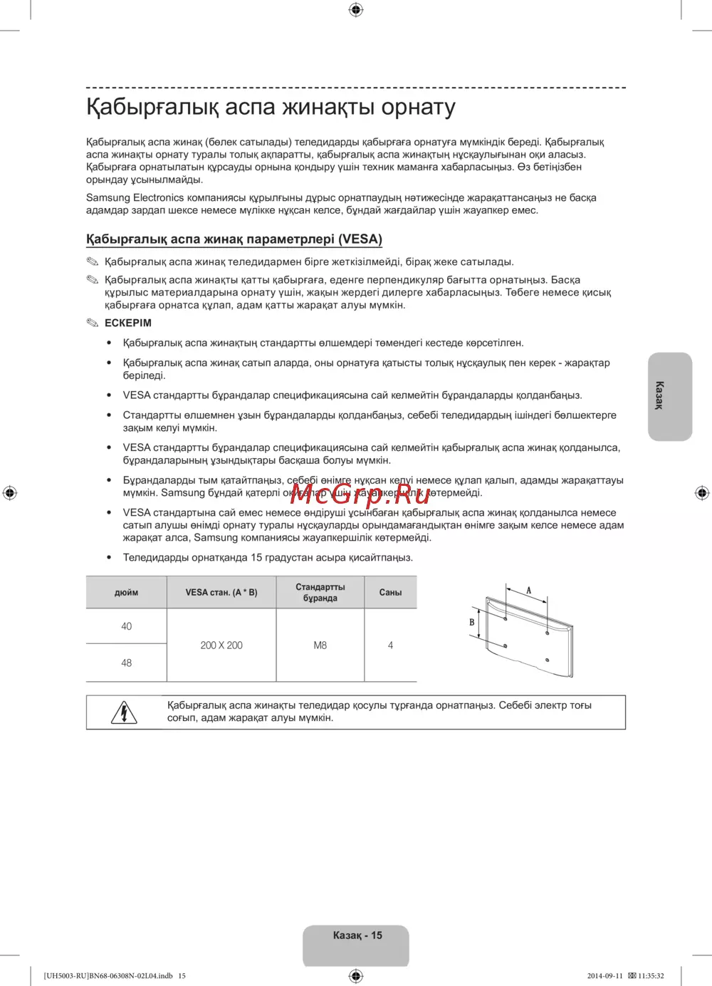 - Қабырғалық аспа жинақ параметрлері vesa p.87