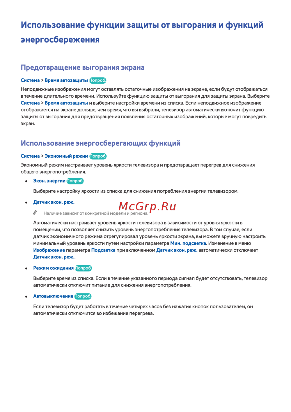 - Использование функции защиты от выгорания и функций энергосбережения p.4