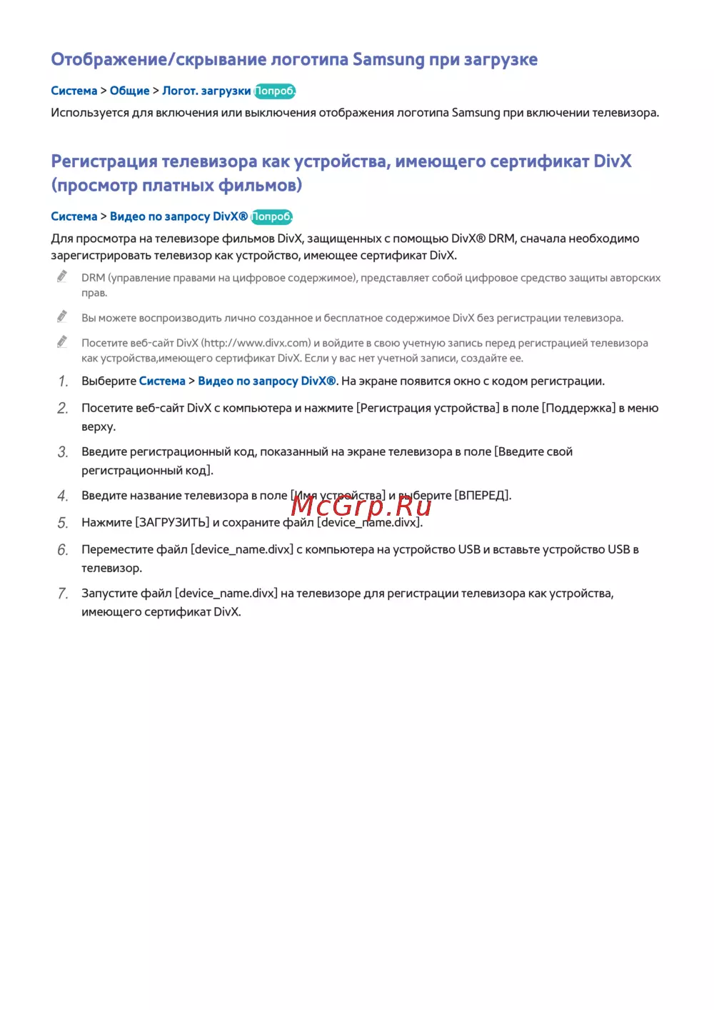 Samsung UE48H5203AK — как зарегистрировать телевизор для просмотра фильмов DivX [124/166]