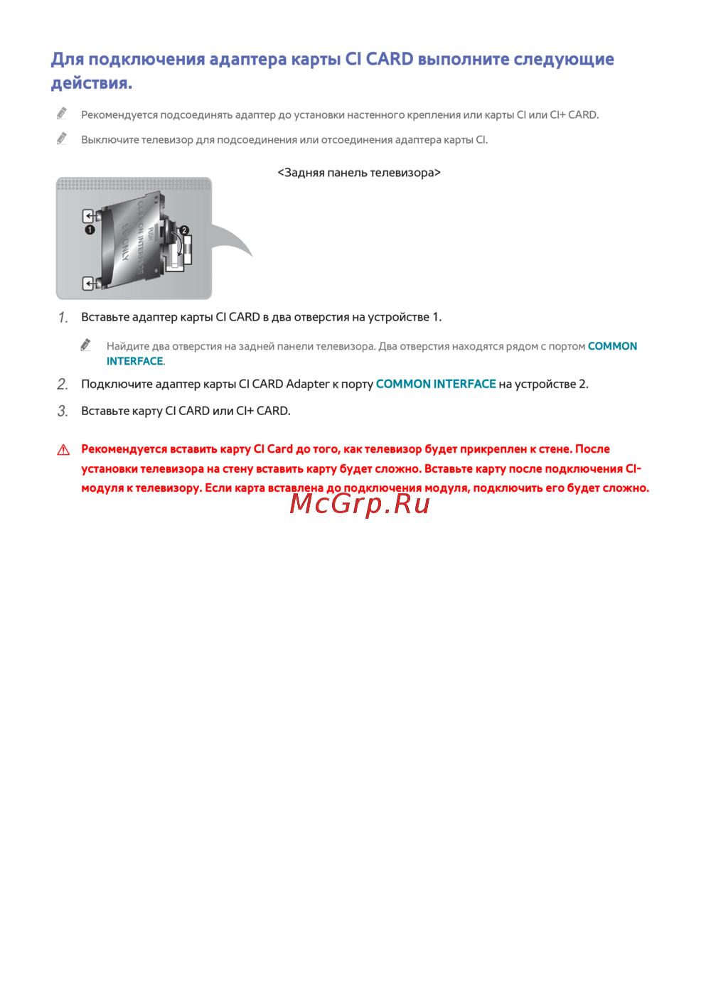 Рекомендуется вставить карту CI Card до того, как телевизор будет прикреплен к стене. После