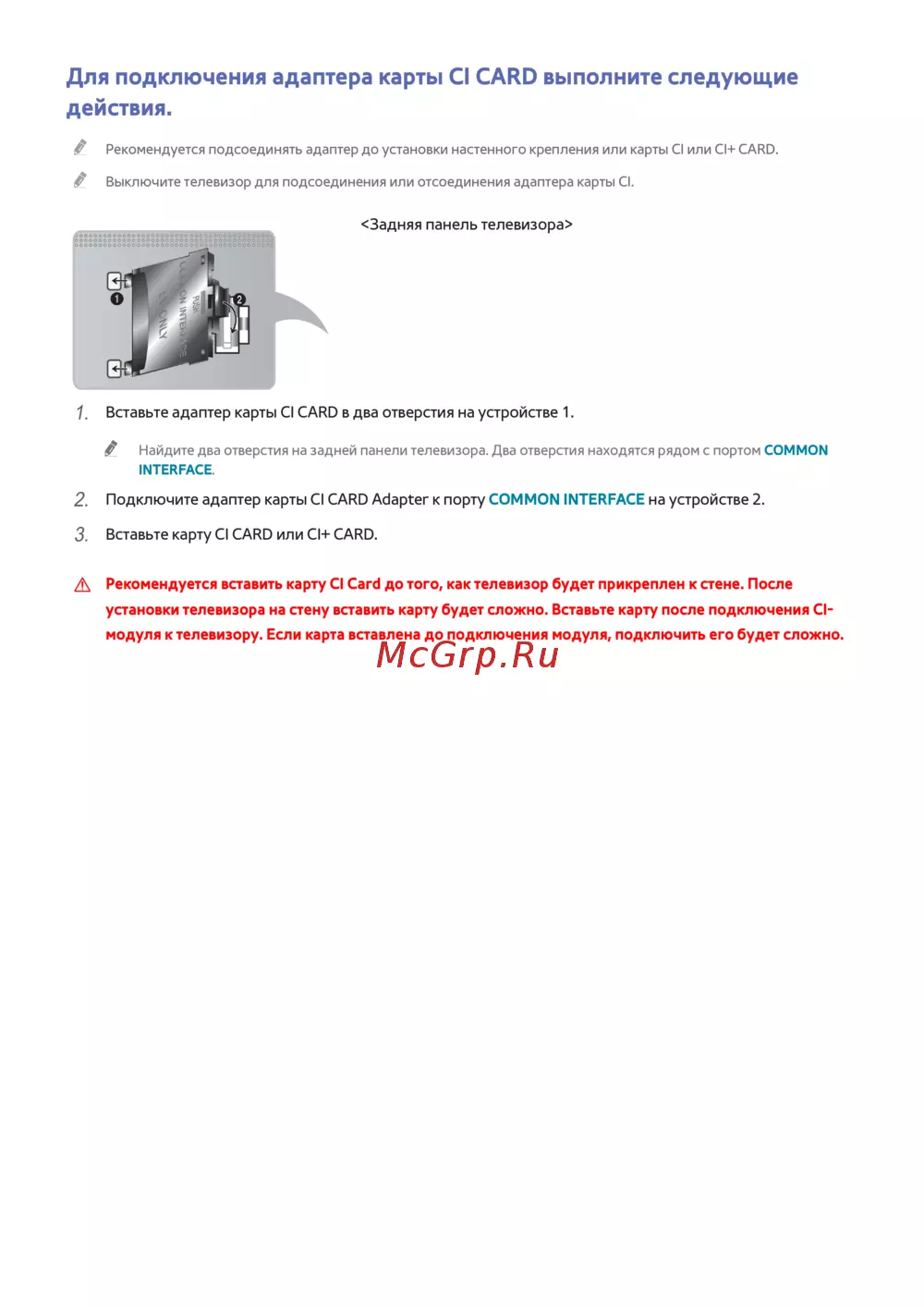 установки телевизора на стену вставить карту будет сложно. Вставьте карту после подключения CI-
