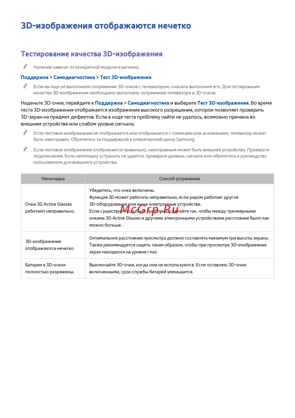 Наденьте 3D-очки, перейдите к Поддержка > Самодиагностика и выберите Тест 3D-изображения. Во время
