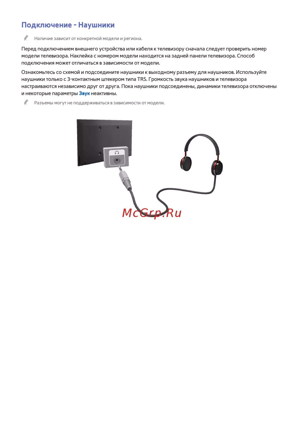 наушники только с 3-контактным штекером типа TRS. Громкость звука наушников и телевизора