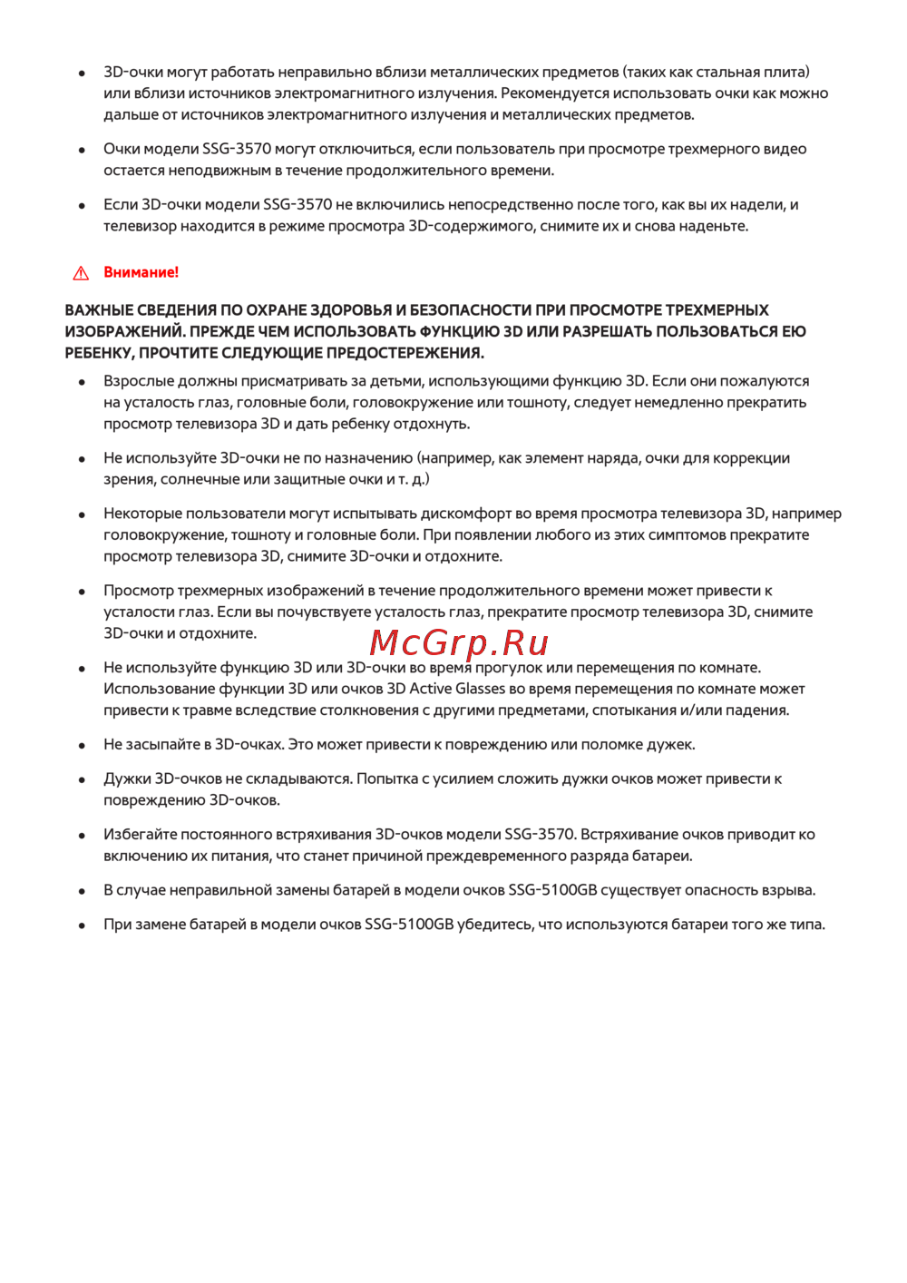 усталости глаз. Если вы почувствуете усталость глаз, прекратите просмотр телевизора 3D, снимите