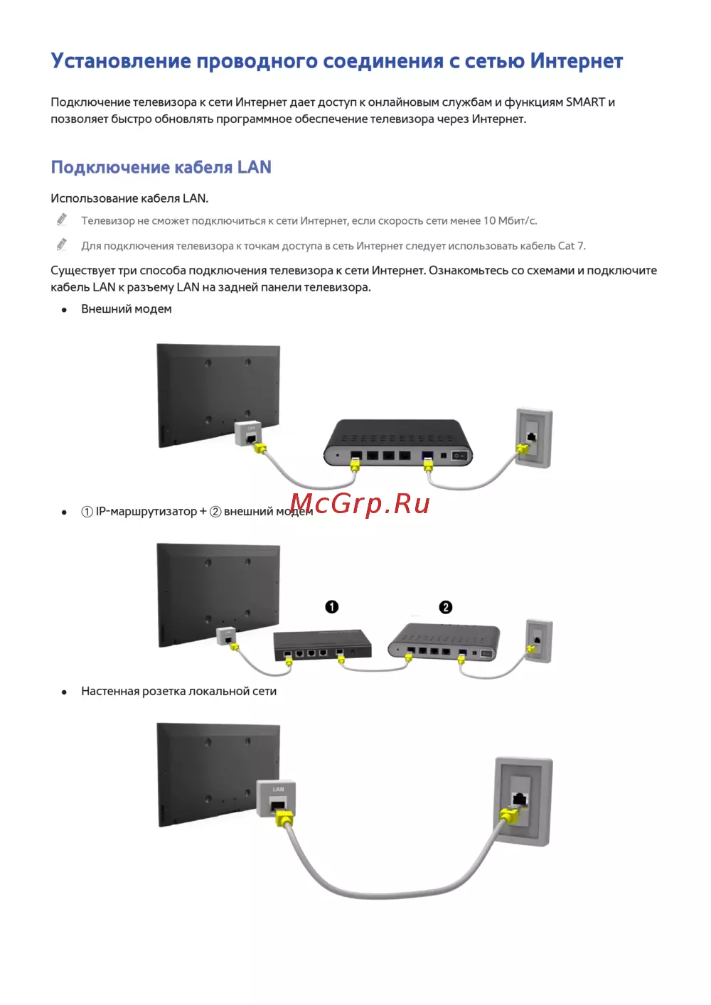 Существует три способа подключения телевизора к сети Интернет. Ознакомьтесь со схемами и подключите