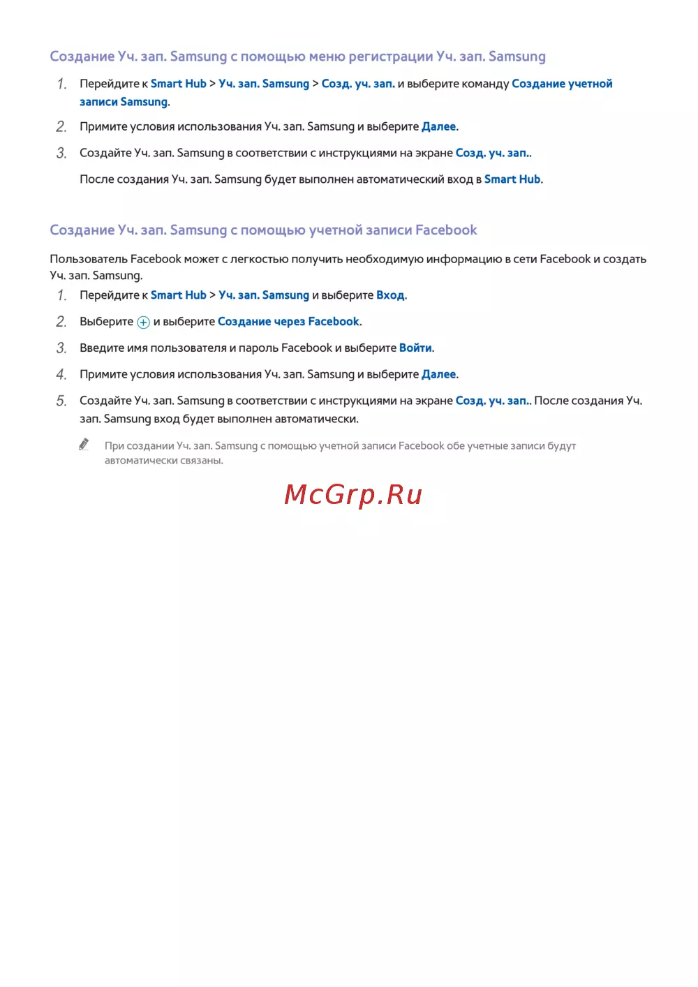 При создании Уч. зап. Samsung с помощью учетной записи Facebook обе учетные записи будут