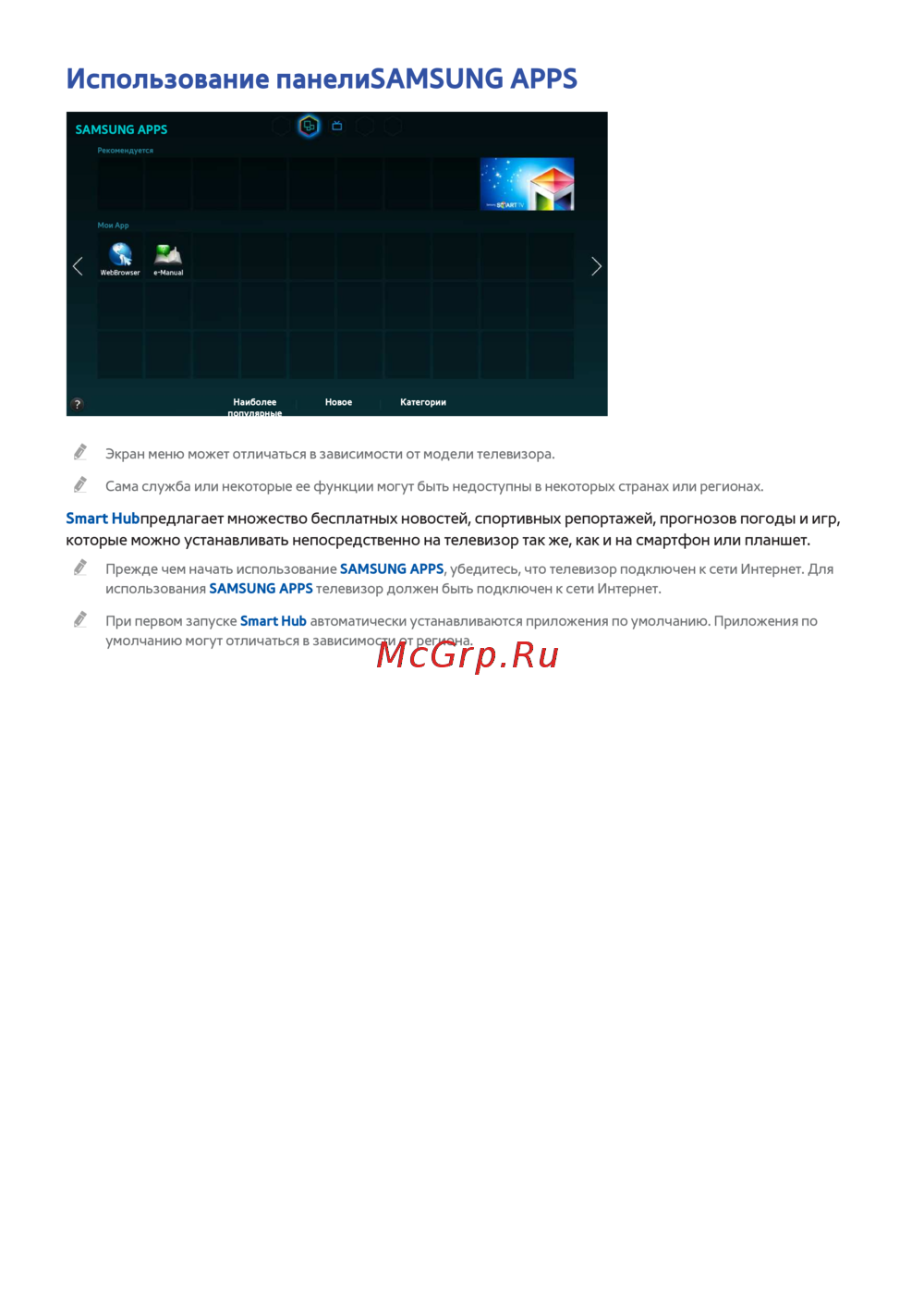 использования SAMSUNG APPS телевизор должен быть подключен к сети Интернет.