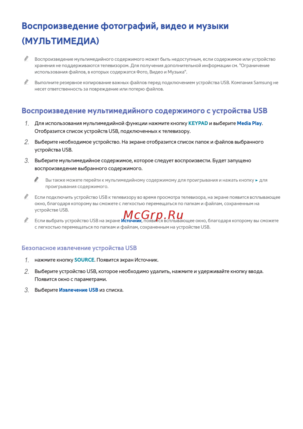 Выполните резервное копирование важных файлов перед подключением устройства USB. Компания Samsung не
