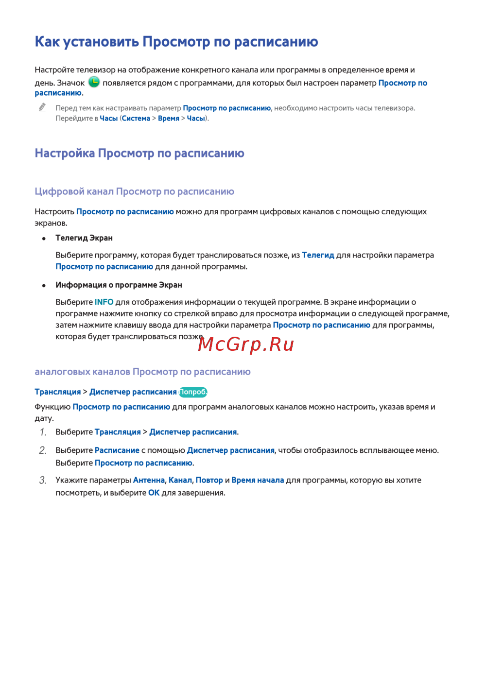 Перед тем как настраивать параметр Просмотр по расписанию, необходимо настроить часы телевизора.