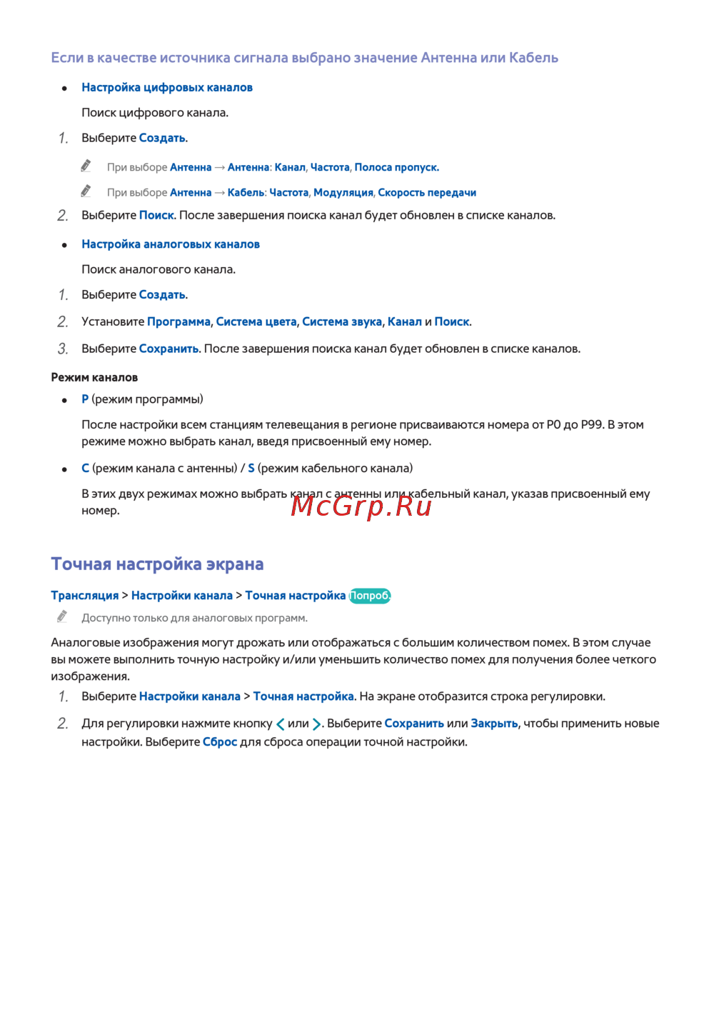 В этих двух режимах можно выбрать канал с антенны или кабельный канал, указав присвоенный ему
