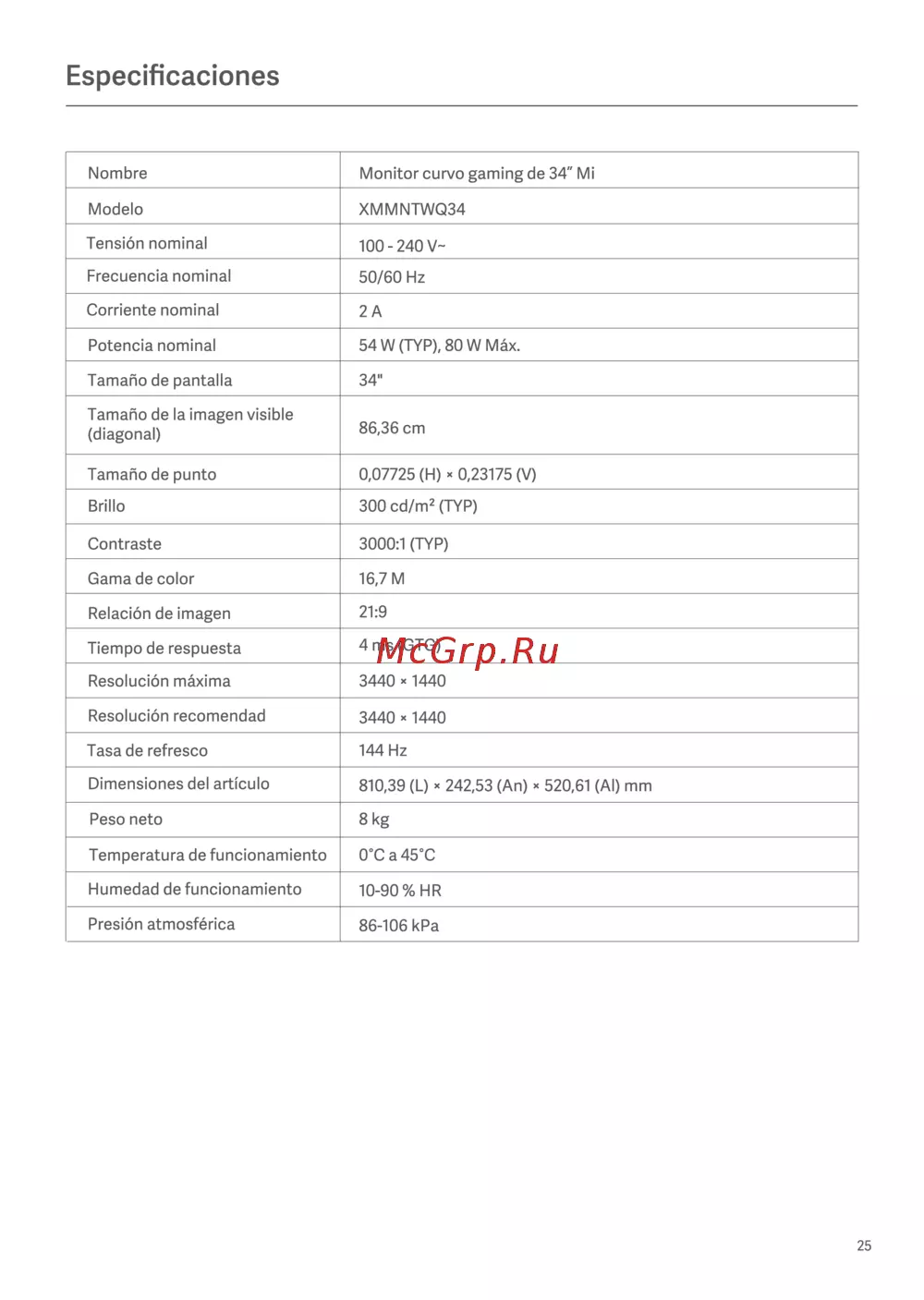 Especificaciones Nombre Monitor curvo gaming de 34 Mi Modelo XMMNTWQ34 Tensión nominal 100 240 V Frecuencia nominal 50 60 Hz Corriente nominal 2A Potencia nominal 54 W TYP 80 W Max Tamaño de pantalla 34 Tamaño de la imagen visible diagonal 86 36 cm Tamaño de punto 0 07725 H 0 23175 V Brillo 300 cd m2 TYP Contraste 3000 1 TYP Gama de color 16 7 M Relación de imagen 21 9 Tiempo de respuesta 4 ms GTG Resolución máxima 3440 1440 Resolución recomendad 3440 x 1440 Tasa de refresco 144 Hz Dimensiones del artículo 810 39 L 242 53 An x 520 61 Al mm Peso neto 8 kg Temperatura de funcionamiento 0 C a 45 C Humedad de funcionamiento 10 90 HR Presión atmosférica 86 106 kPa 25