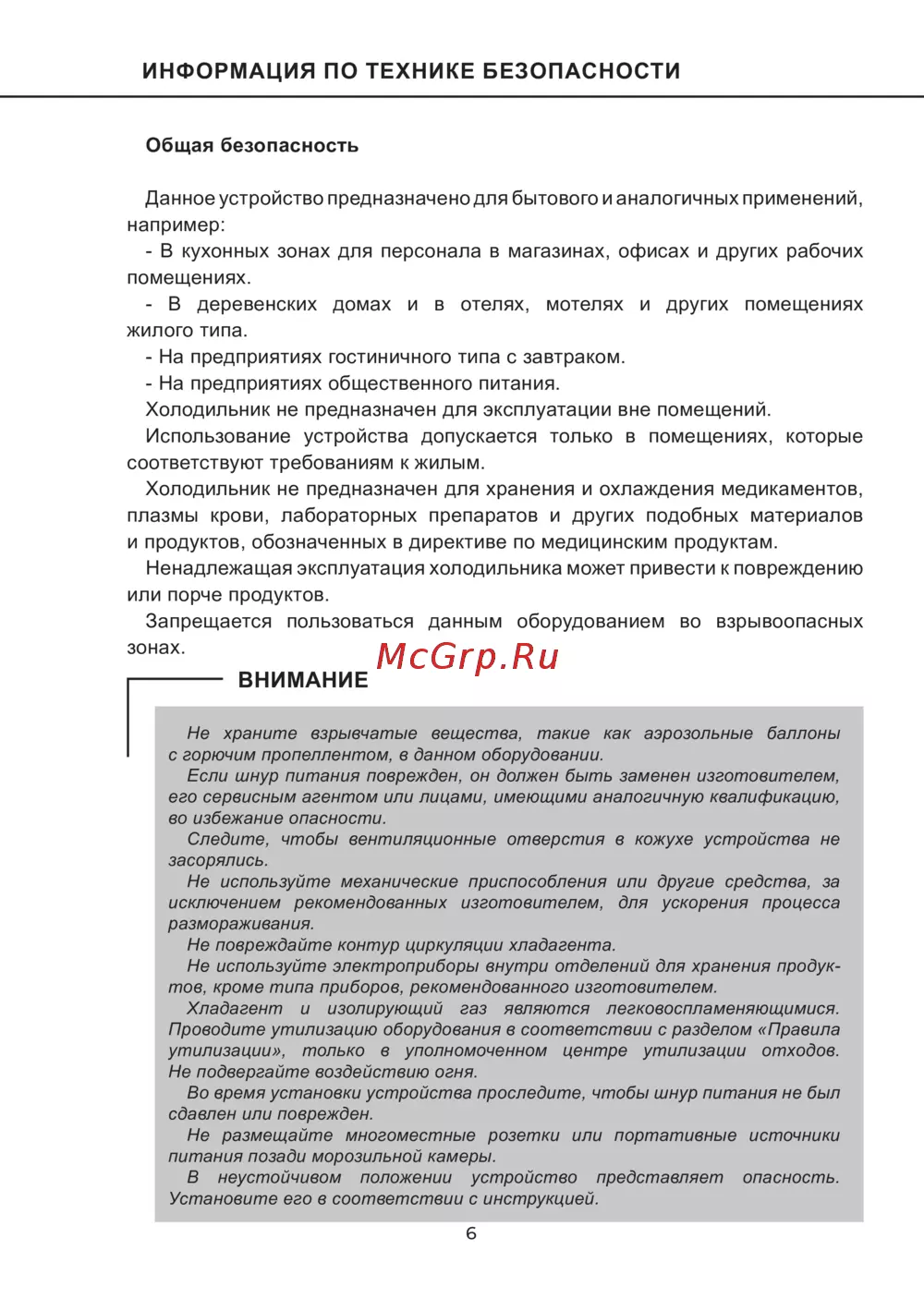 - На предприятиях гостиничного типа с завтраком на предприятиях общественного питания холодильник не предназначен для эксплуатации вне помещений использование устройства допускается только в помещениях которые p.6