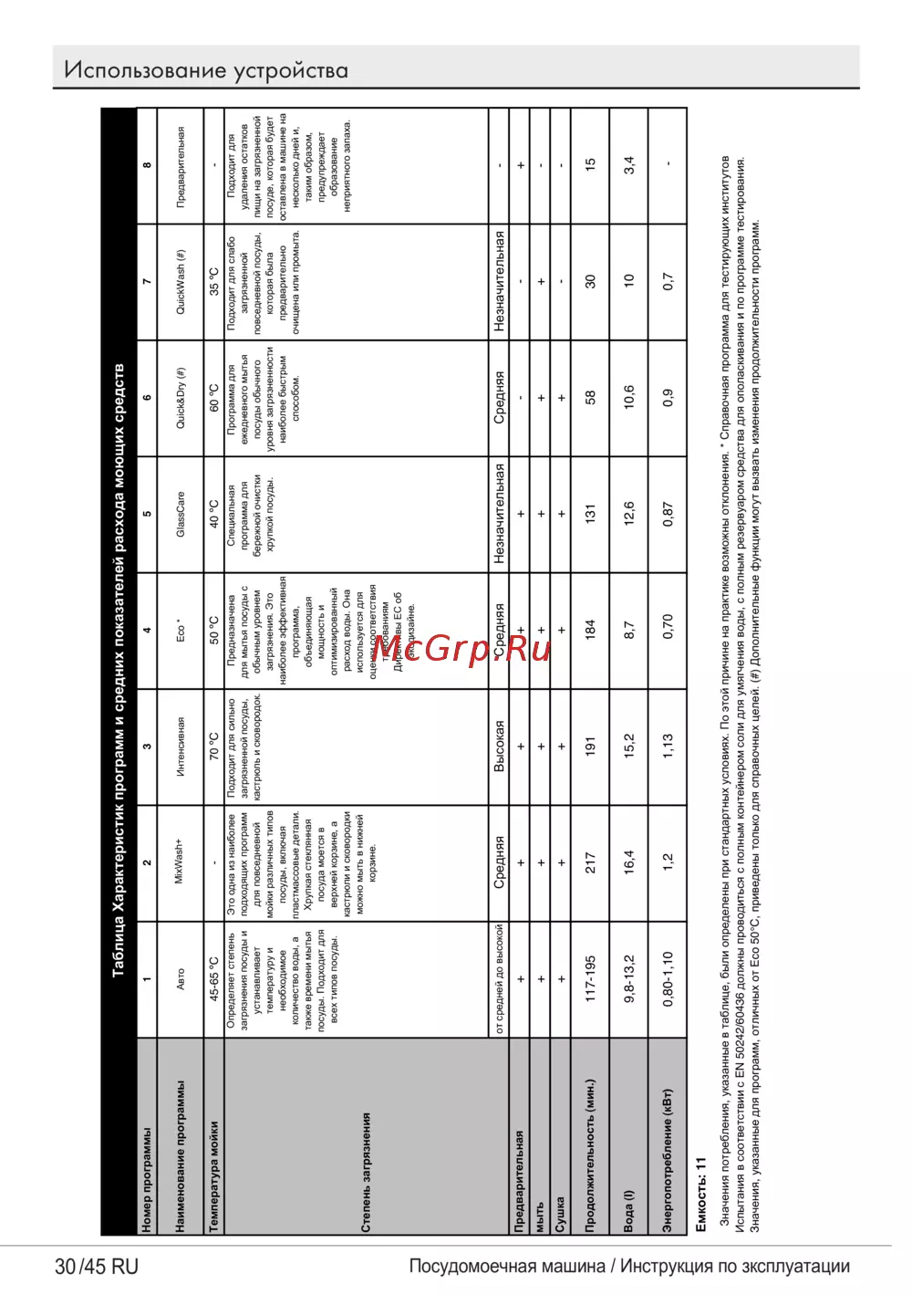 - Таблица характеристик программ и средних показателей расхода моющих средств p.30