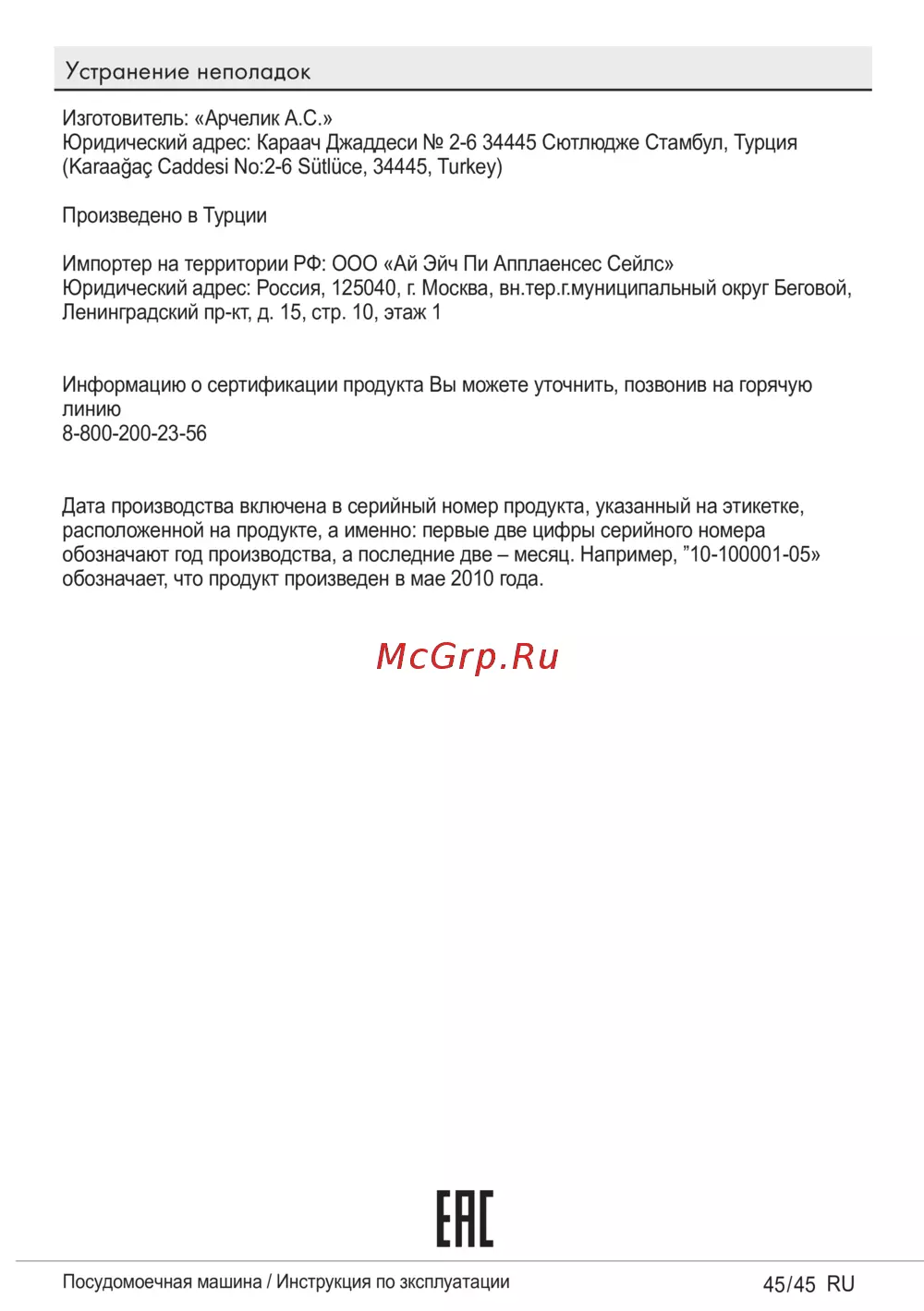 Импортер на территории РФ: ООО «Ай Эйч Пи Апплаенсес Сейлc»