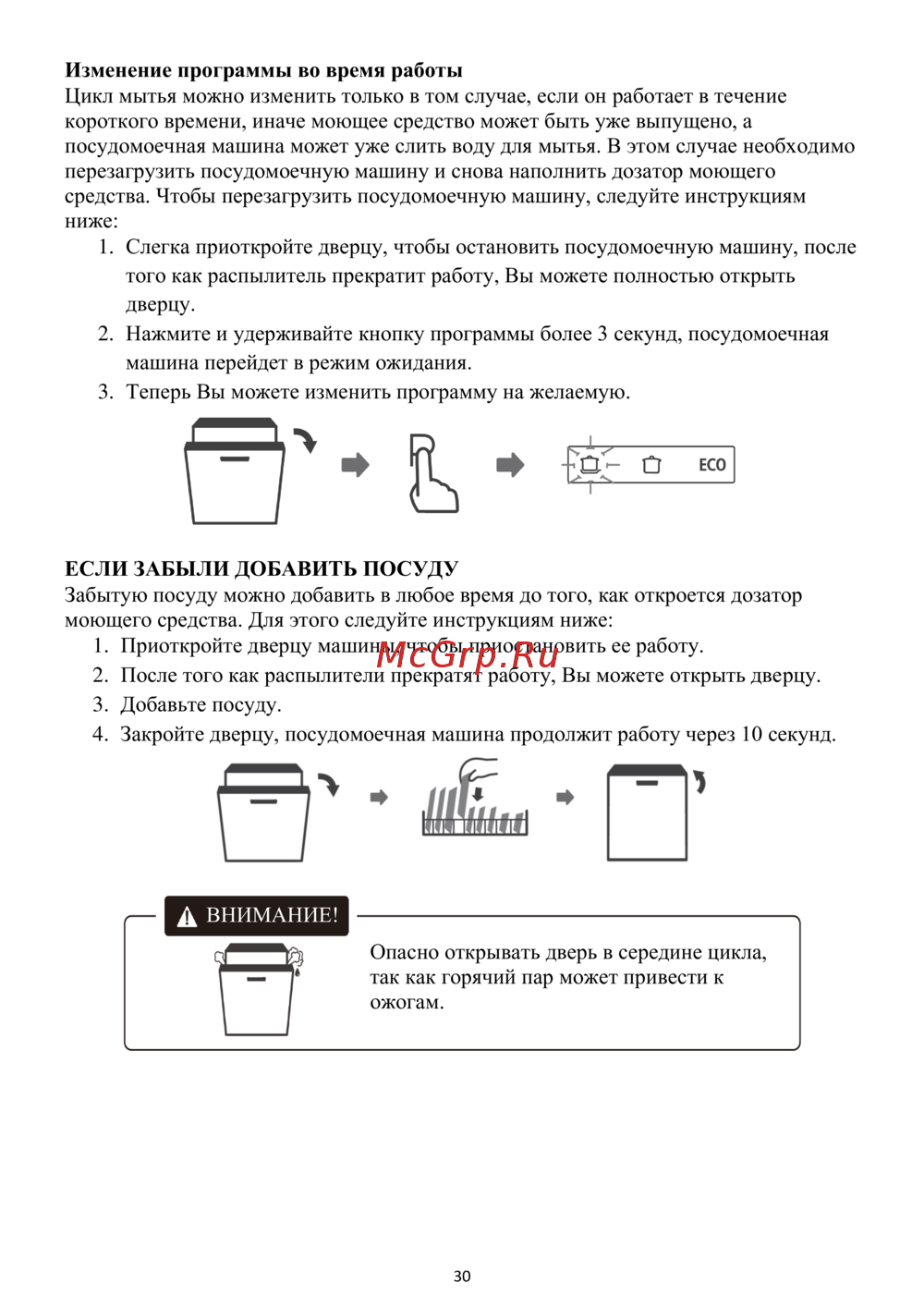 1. Слегка приоткройте дверцу, чтобы остановить посудомоечную машину, после