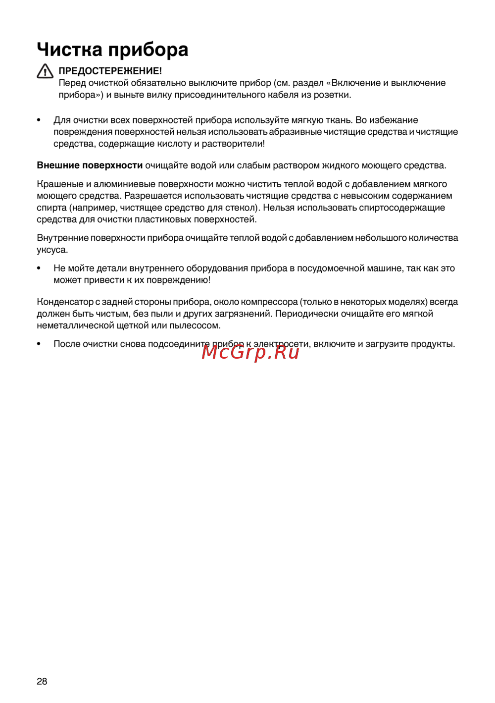 Внутренние поверхности прибора очищайте теплой водой с добавлением небольшого количества