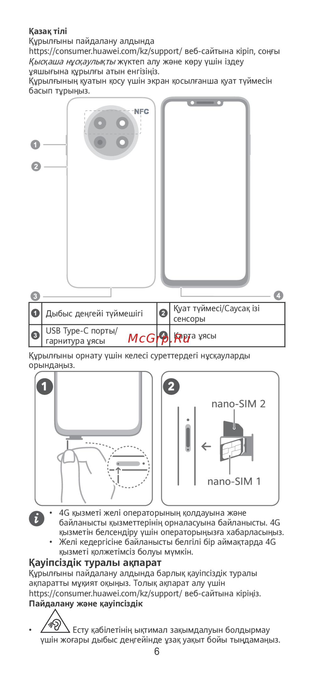 - Қазақ тіліқұрылғыны пайдалану алдында https consumer huawei com kz support веб сайтына кіріп соңғы қысқаша нұсқаулықты жүктеп алу және көру үшін іздеу ұяшығына құрылғы атын енгізіңіз құрылғының қуатын қосу үшін экран қосылғанша қуат түймесін басып тұрыңыз дыбыс деңгейі түймешігіқуат түймесі саусақ ізі сенсорыusb type c порты гарнитура ұясыкарта ұясықұрылғыны орнату үшін келесі суреттердегі нұсқауларды орындаңыз 4g қызметі желі операторының қолдауына және байланысты қызметтерінің орналасуына байланысты 4g қызметін белсендіру үшін операторыңызға хабарласыңыз желі кедергісіне байланысты белгілі бір аймақтарда 4g қызметі қолжетімсіз болуы мүмкін қауіпсіздік туралы ақпаратқұрылғыны пайдалану алдында барлық қауіпсіздік туралы ақпаратты мұқият оқыңыз толық ақпарат алу үшін https consumer huawei com kz support веб сайтына кіріңіз пайдалану және қауіпсіздік есту қабілетінің ықтимал зақымдалуын болдырмау үшін жоғары дыбыс деңгейінде ұзақ уақыт бойы тыңдамаңыз қолайлы өнім температуралары пайдала p.7