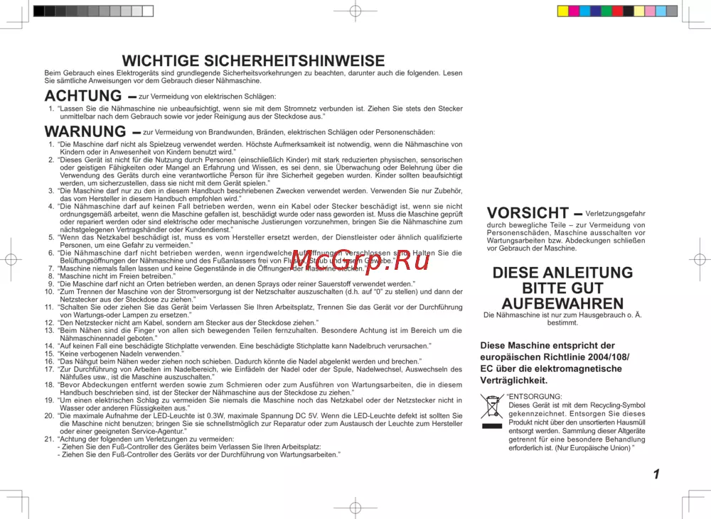 1. “ Lassen Sie die Nähmaschine nie unbeaufsichtigt, wenn sie mit dem Stromnetz verbunden ist. Ziehen Sie stets den Stecker