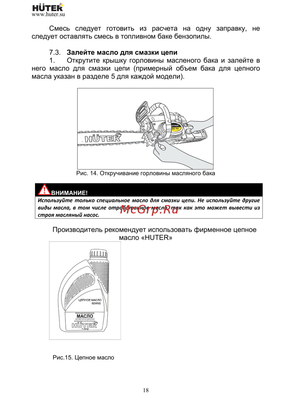 - Производитель рекомендует использовать фирменное цепное масло huter p.18