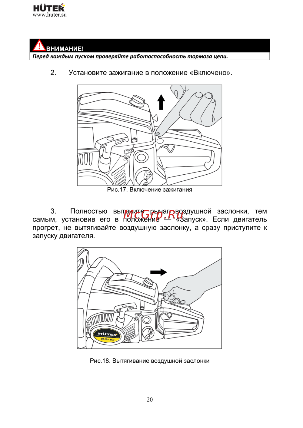 Huter BS-52 [20/44] Полностью вытяните рычаг воздушной заслонки тем самым установив его в положение запуск если двигатель прогрет не вытягивайте воздушную заслонку а сразу приступите к запуску двигате...