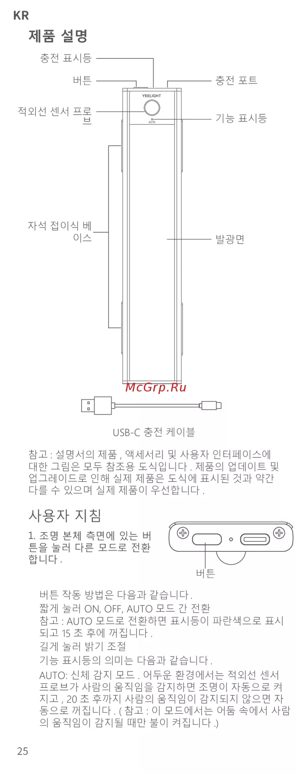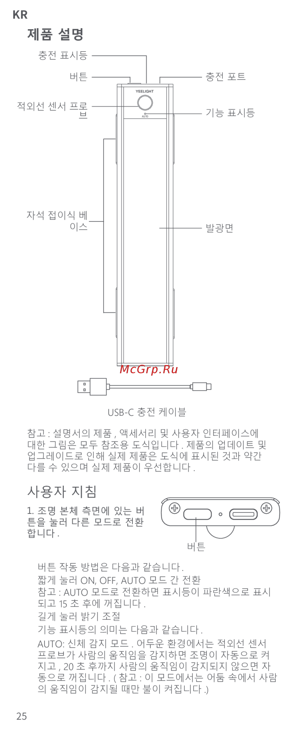 짧게 눌러 ON, OFF, AUTO 모드 간 전환