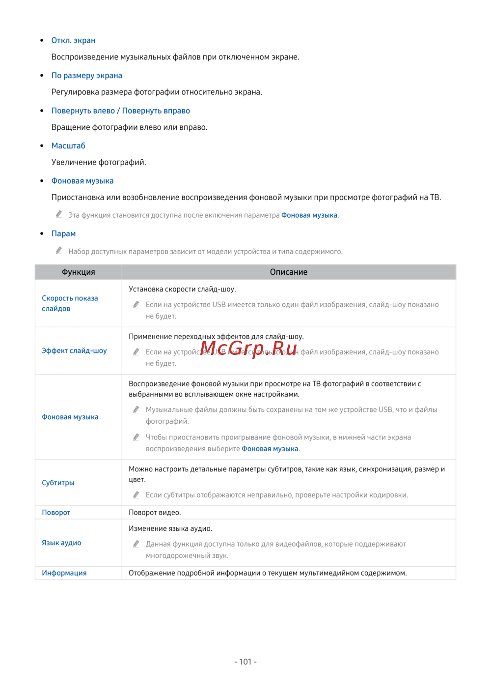 Набор доступных параметров зависит от модели устройства и типа содержимого.