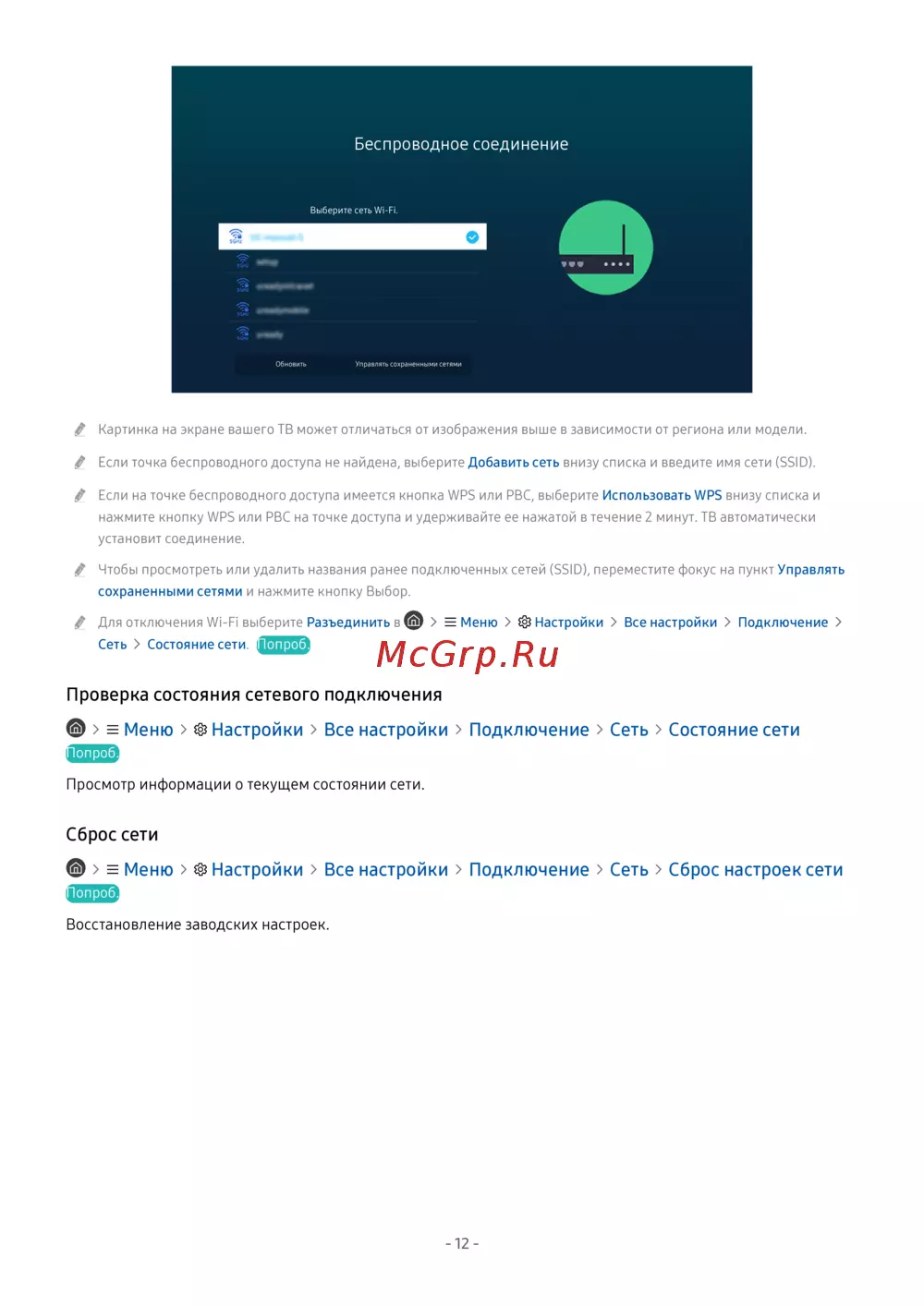 - Меню настройки все настройки подключение сеть сброс настроек сети p.12